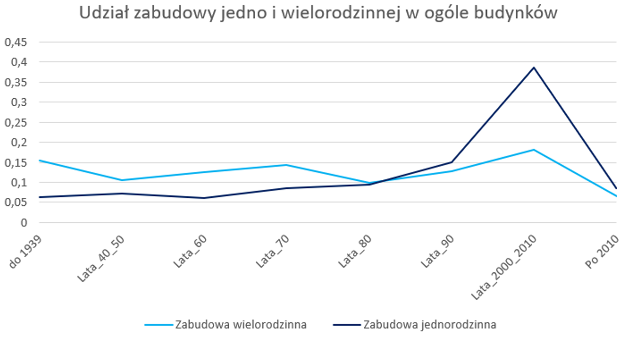 Jak ma się do tego udział zabudowy jedno i wielorodzinnej? Tutaj również można zaobserwować znaczący przyrost budynków od 1980 do 2010 roku. Warto zwrócić uwagę, że był to również czas, w którym zabudowa jednorodzinna na terenie Warszawy zaczęła przekraczać liczbę budynków wielorodzinnych.