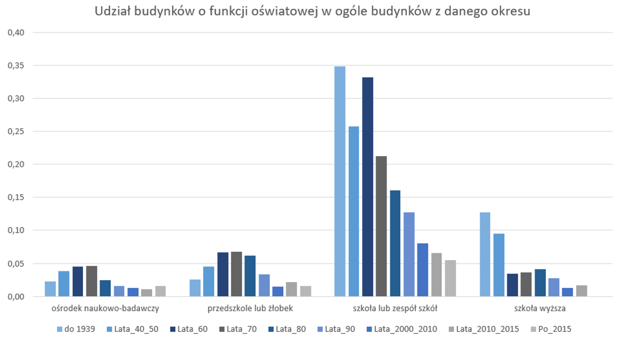 Kolejną funkcją, którą sprawdzono, jest udział budynków o przeznaczeniu na oświatę. Widać, że dla szkół i uczelni wyższych aranżowane są często budynki starszej zabudowy. Dla ośrodków naukowo-badawczych dominują obiekty z lat 60. i 70. Podobnie sytuacja wygląda dla przedszkoli i żłobków, jednak wartości dla żadnego okresu nie odbiegają tak znacząco od średniej, która wynosi 0,08 budynków.