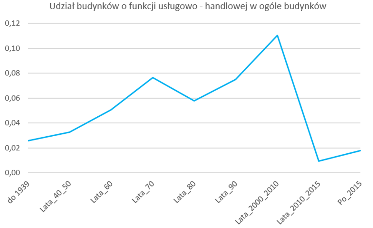 Na podstawie danych z Bazy danych obiektów topograficznych (BDOT10k) widać, że najwięcej budynków o funkcji usługowo handlowej zaczęło powstawać od lat 80. i rosło nieprzerwanie, osiągając swój szczyt w latach 2000-2010.