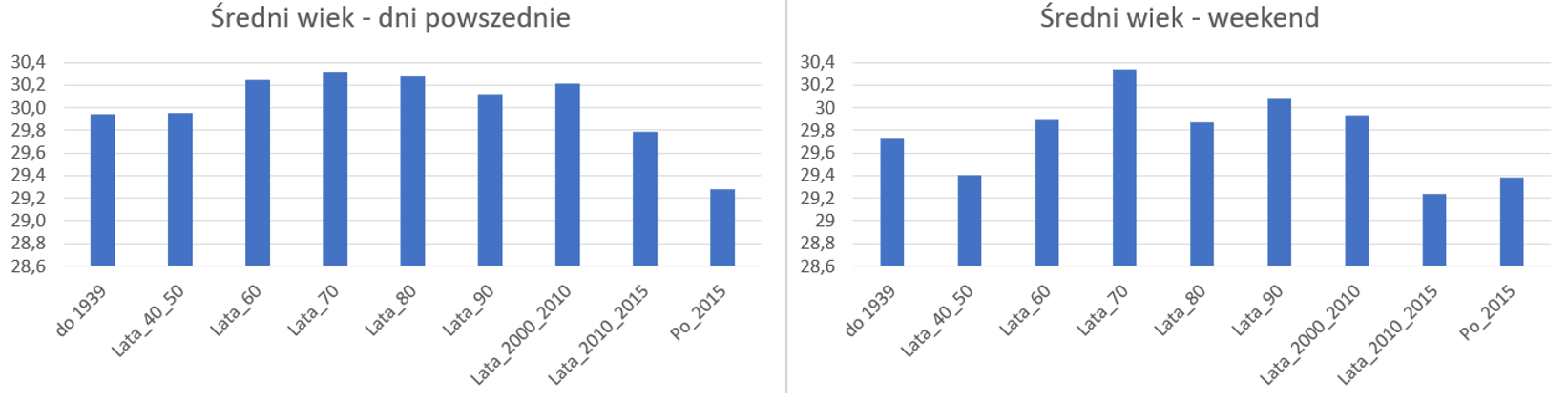 Średnia wieku przechodniów w dni powszednie jest większa od średniej w weekendy bez względu na rodzaj zabudowy. Można wyróżnić kilka obszarów, w których różnice są najbardziej wyraźne. W Śródmieściu, na Pradze Północ, jak i w Części Pragi Południe (oprócz Gocławia) dominuje zabudowa sprzed 1980 roku. Na tych samych obszarach widać spadek wieku pieszego w weekendy w stosunku do dni powszednich. Z danych Głównego Urzędu Statystycznego wynika, że Śródmieście jest dzielnicą z największym udziałem osób powyżej 65. roku życia. Praga-Południe i Praga-Północ plasują się kolejno na czwartym i jedenastym miejscu. Jednak patrząc na udział osób do 14. roku życia, najmniejszym wynikiem wyróżnia się Śródmieście i Praga-Północ. Patrząc więc na zameldowanych dzielnice te zamieszkują w dużej mierze osoby starsze. To może wskazywać, że w weekendy rejony te przyciągają osoby młodsze do korzystania z ich bogatej ofert usługowej oraz kulturowej.