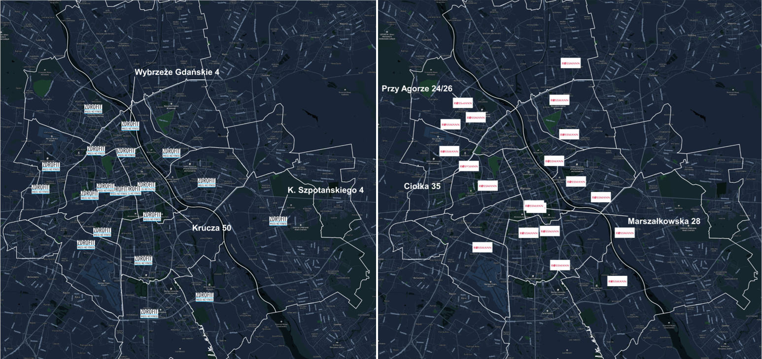 Analizie poddaliśmy również sieć siłowni Zdrofit, którym przydzieliliśmy grupę docelową osób w wieku 30-45 lat. Najlepszą lokalizacją wyróżnia się punkt na Wybrzeżu Gdańskim, w którym udział grupy docelowej wynosi 39%. Kolejny z najlepszym wynikiem to lokal na ul. Szpotańskiego, który charakteryzuje się udziałem pieszych w wybranej grupie wiekowej na poziomie 34%. Z kolei niskim potencjałem wyróżnia się siłownia na ul. Kruczej, gdzie udział pieszych w wieku 30-45 lat jest o prawie 15% poniżej średniej, które wynosi 33%. Punkt ten cechuje się jednak dużym udziałem pieszych w wieku 15-30 lat – 45%, co daje wyniki o 16% powyżej średniej.