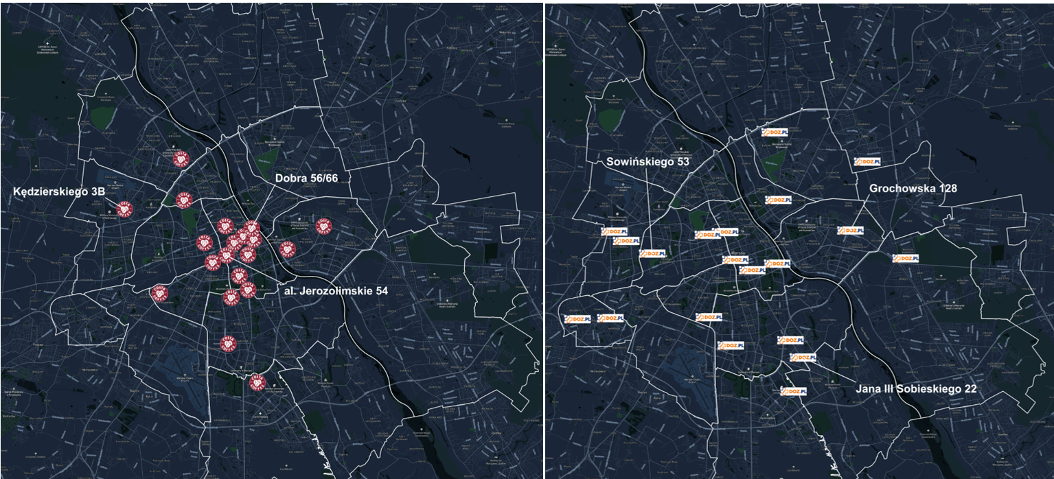 Przeprowadziliśmy analizę dla czterech firm, które są zlokalizowane na terenie Warszawy. Każdej z nich przyporządkowaliśmy przykładową grupę odbiorców do której skierowana jest ich oferta. Chcąc pokazać jakie różnice w demografii występują między poszczególnymi lokalizacjami spośród 20 losowych punktów wybraliśmy dwie wyróżniające się dużym udziałem grupy docelowej w ruchu pieszym i jedną z niewielkim dopasowaniem.