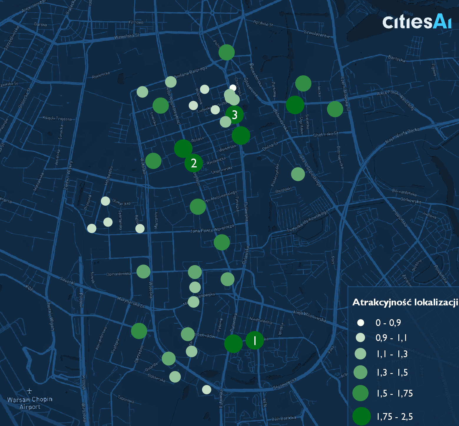 Rysunek 3: Najkorzystniejsze lokalizacje marketów osiedlowych na Mokotowie. Źródło: CitiesAI - 30 mln zdjęć oraz GUS