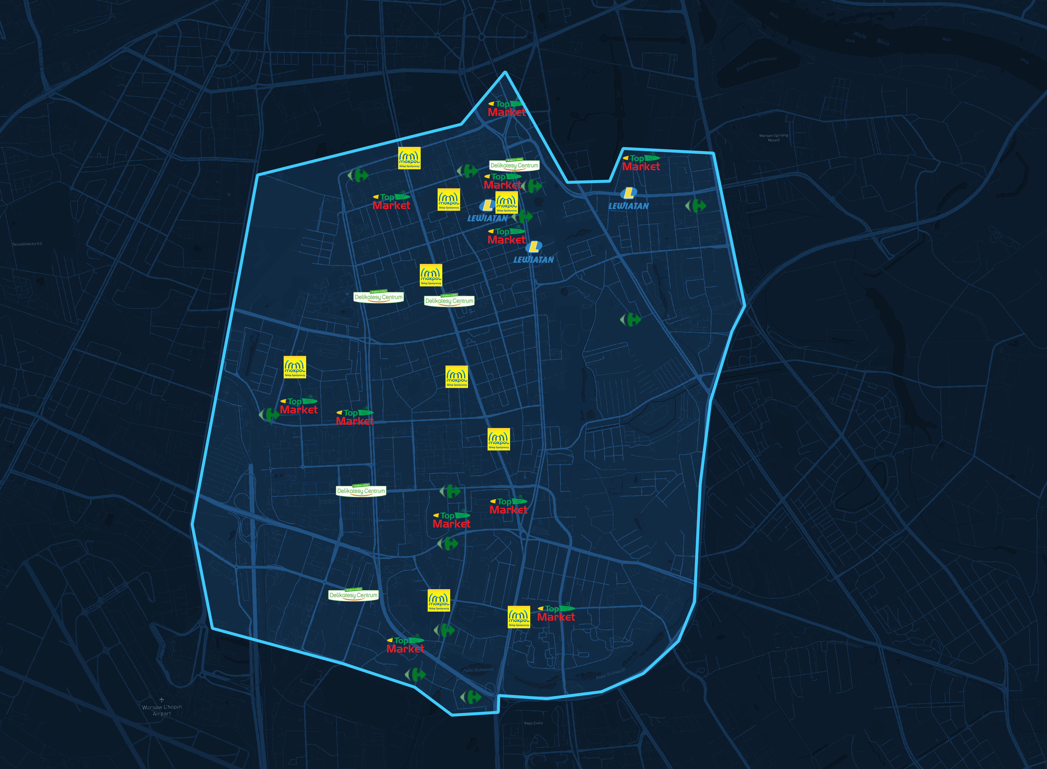Przyjrzeliśmy się także 40 osiedlowym marketom, które należą do 5 sieci: Carrefour Express (12 lokalizacji), Top Market (11 lokalizacji), Mokpol (9 lokalizacji), Delikatesy Centrum (5 lokalizacji) i Lewiatan (3 lokalizacje). Dane o lokalizacji supermarketów, jak i konkurencji pobraliśmy ze stron firmowych analizowanych sieci.