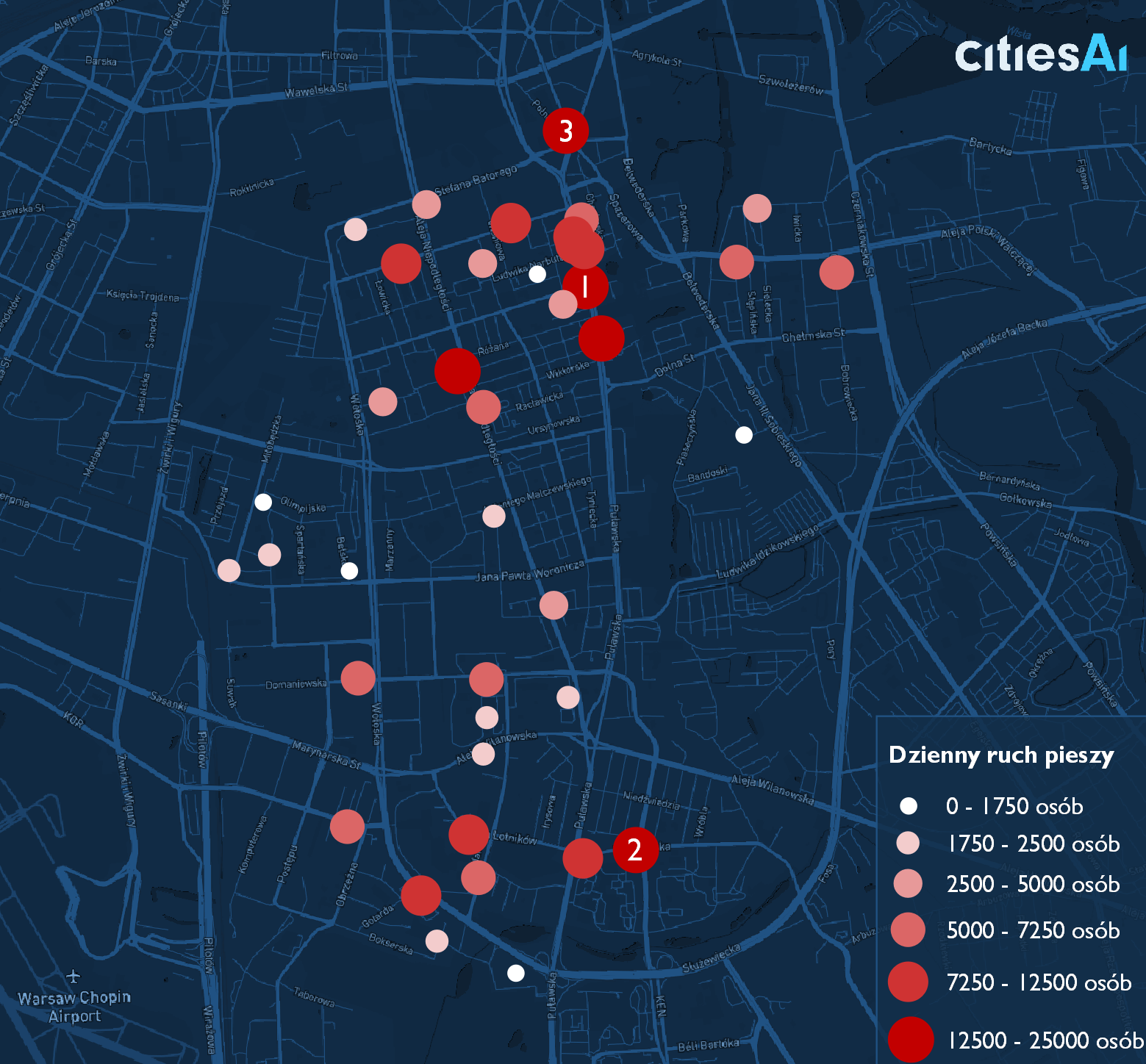 Rysunek 5: Miejsca na Mokotowie, w których występuje największy ruch pieszych . Źródło: CitiesAI - 30 mln zdjęć.
