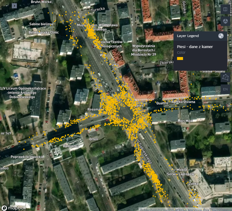 Rysunek 1: Wizualizacja ruchu pieszego na skrzyżowaniu Dolna/Belwederska. Źródło: CitiesAI