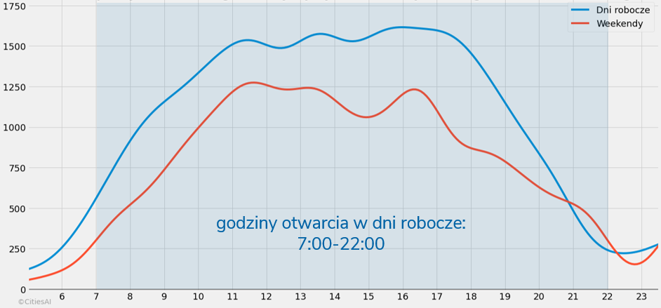 Rysunek 4: Ruch pieszy w rozkładzie godzinowym przy Carrefour Express - Puławska 30. Źródło: dane Cities AI - 34630 zdjęć.