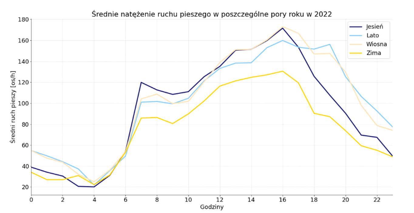 Bez względu na porę roku, szczyt poranny i popołudniowy ruchu pieszego wypada kolejno około godziny 8 i 17. Zimą natężenie ruchu było najmniejsze i osiągało swoją maksymalną wartość na poziomie 131 os/h o godzinie 17. Najwięcej pieszych w szczycie popołudniowym zanotowano jesienią i wiosną. W szczycie porannym najwięcej pieszych zaobserwowano również jesienią. Ze względu na dłuższy dzień słoneczny wiosną i latem po szczycie popołudniowym ruch nie spada tak szybko, a natężenie powyżej 140 os/h jest widoczne nawet do 21.