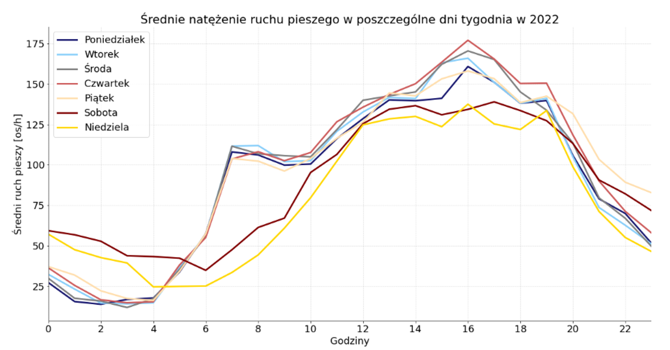Analizując ruch w poszczególne dni tygodnia wyraźnie widać większą liczbę pieszych w godzinach nocnych (1-5) w sobotę i niedziele. Z kolei w godzinach popołudniowych w weekend ruch jest mniejszy i nie występuje szczyt poranny. Po 21 najwięcej pieszych obserwuje się w piątki i soboty.