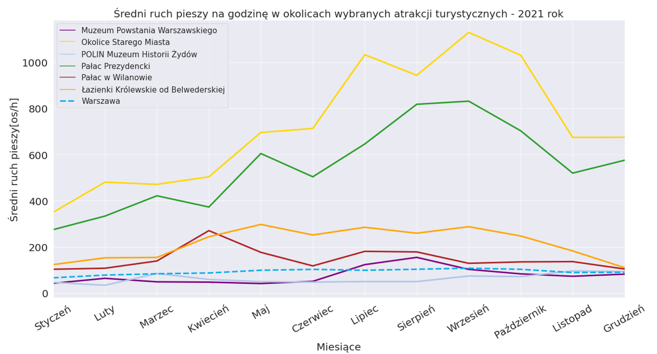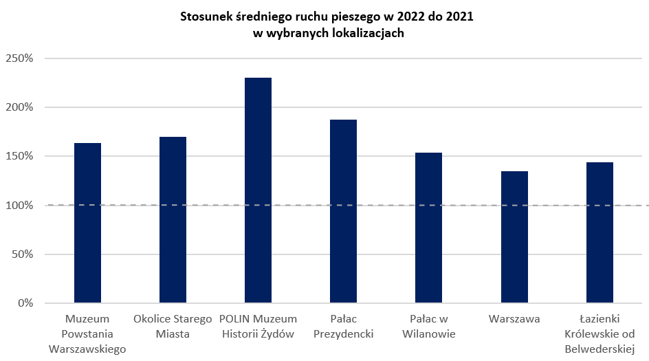 Tak jak wspomniano wcześniej, w 2022 rok ruch pieszy w Warszawie wzrósł w stosunku do 2021. Nie dziwi więc, że i w okolicach wybranych atrakcji turystycznych zanotowano wzrost ruchu pieszego. Największy, o ponad 100%, zaobserwowano w okolicach Muzeum POLIN. Tak duży wzrost może wynikać z powrotu studentów mieszkających w zlokalizowanym w okolicy akademiku. Muzeum posiada również dobrze zorganizowaną, otwartą dla wszystkich strefę zieloną wokół budynku co mogło przyciągać pieszych. Poza tym, wzrosty o ponad 50% można było zauważyć w okolicach Muzeum Powstania Warszawskiego, Starego Miasta, Pałacu Prezydenckiego oraz Pałacu w Wilanowie.