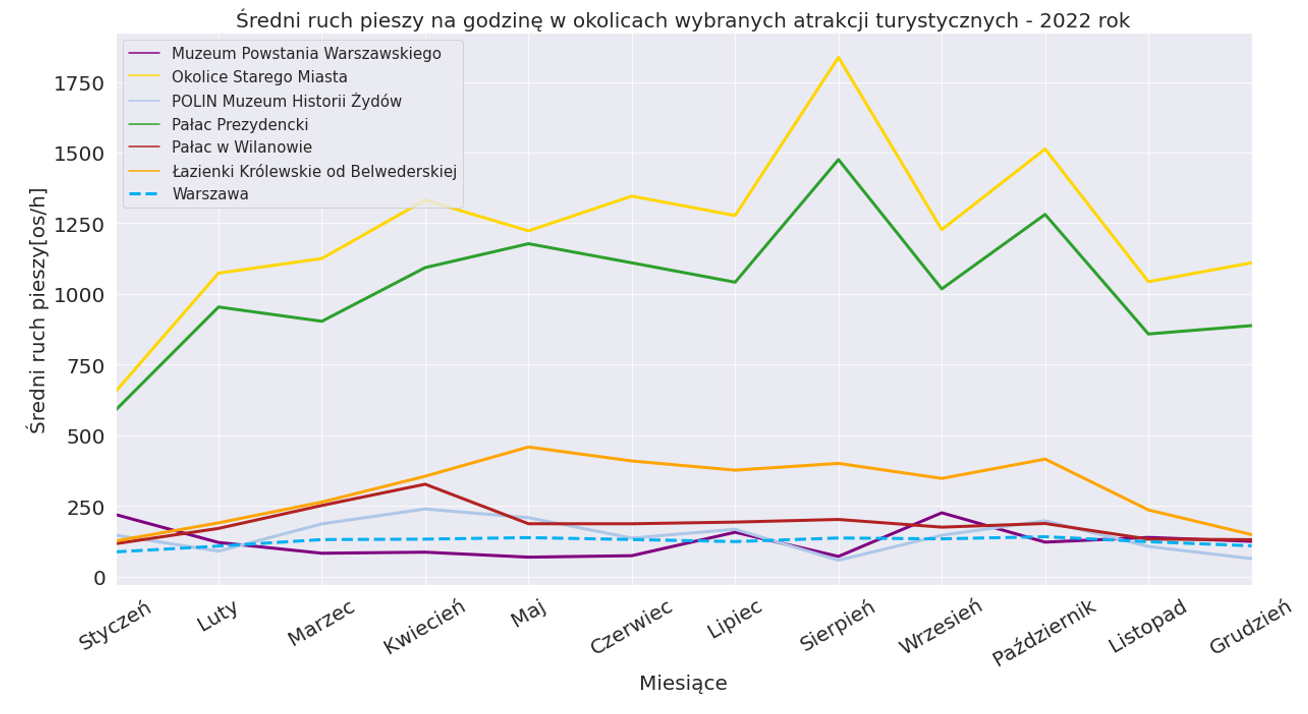 W przypadku 2022 roku, trzy lokalizacje z największym ruchem pieszym to tak samo Stare Miasto, Pałac Prezydencki i Łazienki Królewskie (od strony Belwederskiej), jednak ruch już od pierwszych miesięcy jest prawie dwa razy większy niż w roku 2021. Na Starym Mieście od marca 2022 liczba pieszych na ulicach przekroczyła wartość zanotowaną jako najwyższą dla 2021 roku (ponad 1130 os/h) i nie spada poniżej praktycznie do końca roku. W przypadku Pałacu w Wilanowie w 2022 rok ruch wzrastał od początku roku, osiągając maksymalną wartość 327 os/h w kwietniu, po czym do końca roku utrzymywał się poniżej 200 os/h.