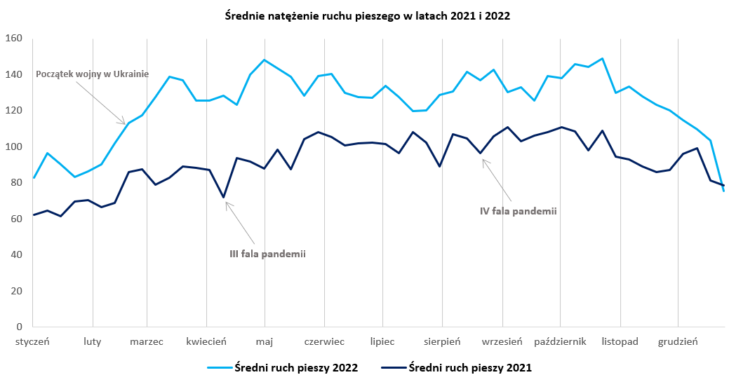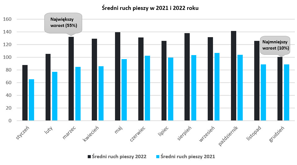 W 2021 roku duży wpływ na ruch pieszy miała pandemia COVID-19 i wprowadzane ograniczenia wywołane kolejnymi falami wirusa. Średni ruch w 2022 roku był o 34% większy niż w roku 2021. Najmniej pieszych zaobserwowano w styczniu, gdzie ruch wynosił średnio 66 pieszych na godzinę, na chodnikach, które mierzyliśmy w godzinach 6-23. Jednak największa różnica między miesiącami w tych latach występowała w marcu, gdzie natężenie ruchu pieszego w marcu 2022 było o 55% większe niż w marcu 2021. W grudniu obserwowano najmniejsze różnice pomiędzy latami, na poziomie około 10%.