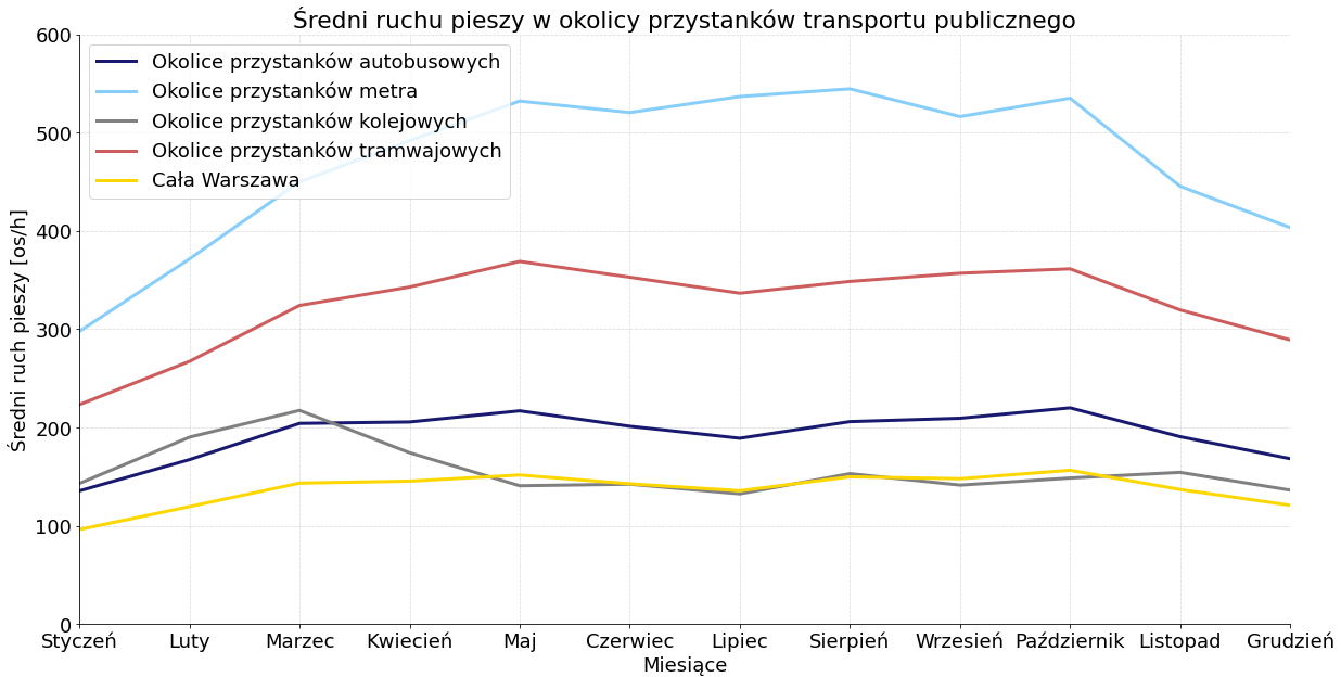 Największe natężenie ruchu pieszego obserwuje się w okolicy przystanków metra, które od maja notują nawet pięciokrotnie większe wartości niż średni ruch dla całej Warszawy. Duży footfall zanotowano również w okolicy przystanków tramwajowych, gdzie od kwietnia do listopada ruch był ponad dwukrotnie większy od średniej warszawskiej. Dla przystanków kolejowych największy ruch pieszy obserwowano w okresie od lutego do kwietnia, co może mieć związek z napływem uchodźców z Ukrainy. Jak podawał w marcu 2022 Urząd Miasta Stołecznego Warszawy „Z danych szacunkowych wynika, że do Warszawy dotarło łącznie ok. 415 tys. gości z Ukrainy, z czego już niemal 300 tys. zatrzymało się w stolicy. To oznacza, że liczba mieszkańców Warszawy wzrosła od początku inwazji o ok. 17 proc.”4. Aktualne dane pt. „Warszawa w kryzysie uchodźczym” można śledzić na stronie UM Warszawa5. Następnie liczba pieszych w okolicach przystanków kolejowych była podobna do średniej dla całej Warszawy. Ruch w okolicy przystanków autobusowych między kwietniem a listopadem utrzymywał się średnio na poziomie 200 os/h, co dawało wartość o 30% większą od średniego ruchu w tym okresie w całym mieście.