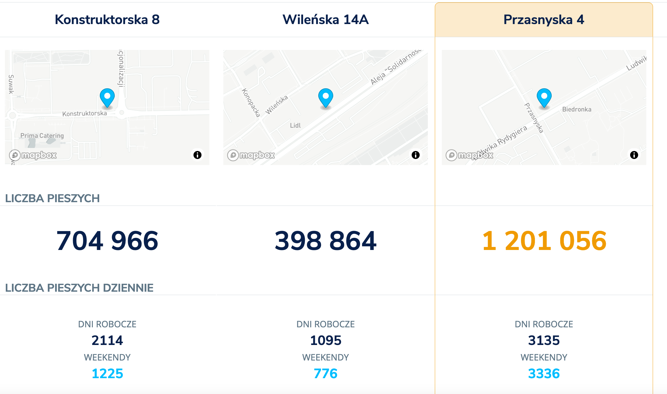 Pierwsze, co zauważymy po otworzeniu raportu, jest liczba pieszych w każdej z lokalizacji.
