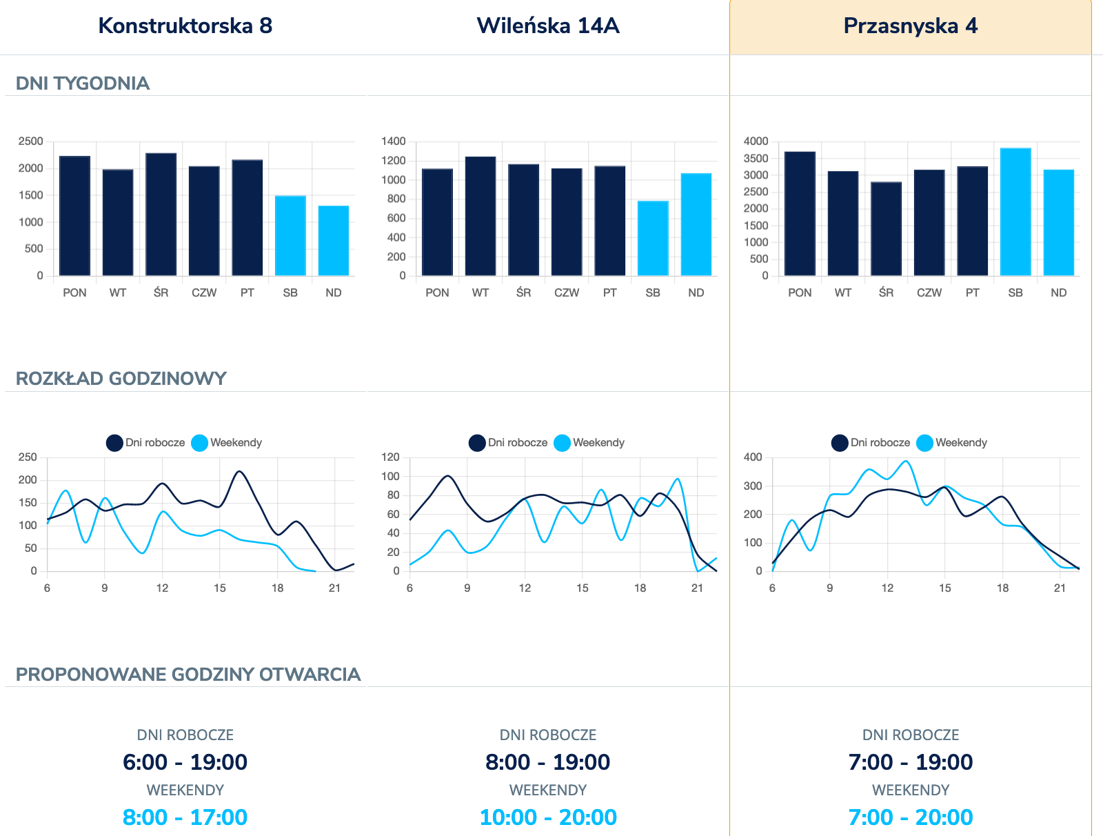 Aby skutecznie zaplanować funkcjonowanie sklepu, przydatną informacją są godziny, w których ruch pieszy jest najwyższy. Z raportu wnioskujemy, że w weekendy na Żoliborzu lokal może być otwarty w godzinach 7:00 – 20:00, zaś przy Wileńskiej dopiero od godziny 10. Przy Konstruktorskiej, gdzie dominują biurowce, obserwuje się znacznie mniej pieszych w weekendy, więc można zamykać już o 17:00.