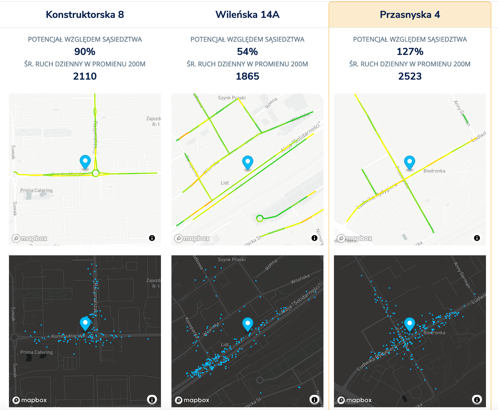 Tak właśnie jest w przypadku Wileńskiej. Wejście do lokalu znajduje się od bardzo ruchliwej al. Solidarności, jednak piesi niechętnie tamtędy przechodzą, a częściej wybierają równoległą Wileńską lub Stalową. Potencjał tej konkretnej lokalizacji względem sąsiedztwa wynosi tu jedynie 54%. W przypadku lokalu przy Przasnyskiej jest wręcz na odwrót - jego potencjał wynosi aż 127%, więc byłby to bardzo dobry wybór spośród innych lokali w tej okolicy. Co ciekawe, mimo tak ogromnej różnicy przy samych lokalach średni ruch pieszych w obu dzielnicach jest bardziej zbliżony.