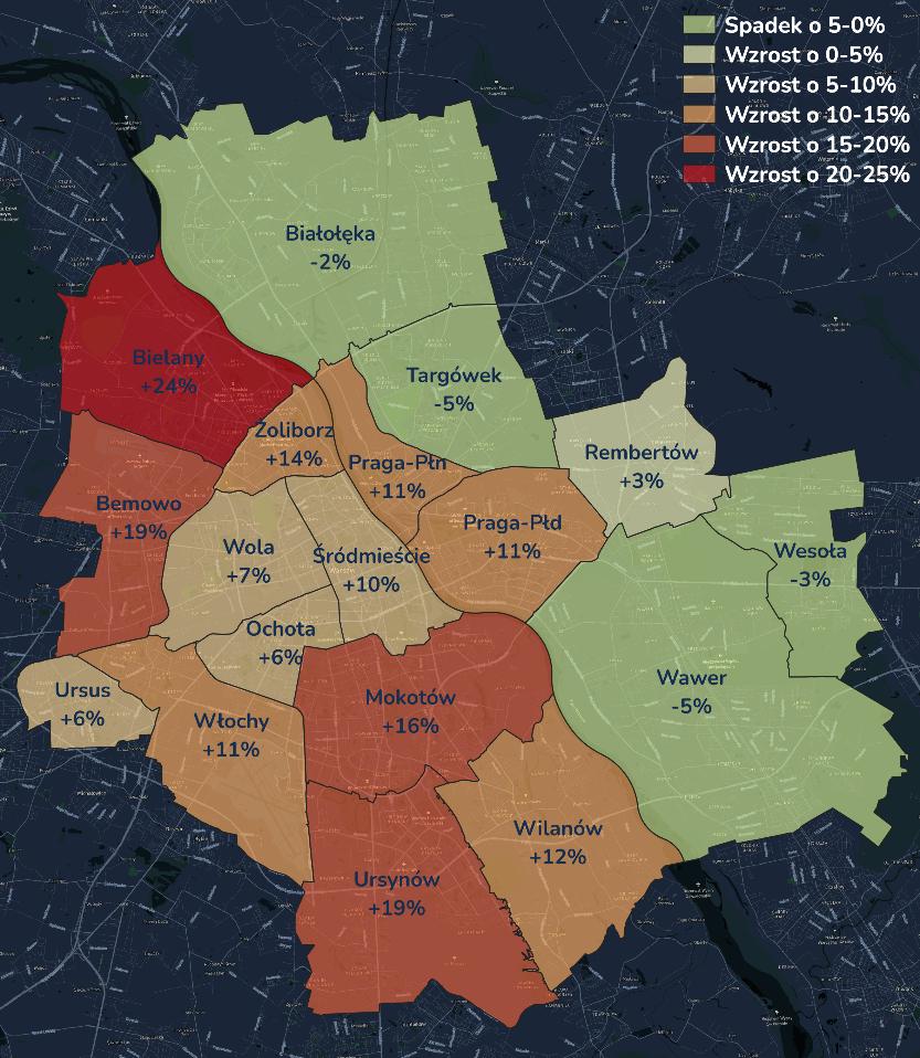 Wszystkie lewobrzeżne dzielnice Warszawy notują wzrost ruchu pieszego. Największe wartości są widoczne na Bielanach (+24%), na Ursynowie (+19%) oraz na Bemowie (19%). Może to wskazywać na to, że dzielnice dobrze skomunikowane z centrum o bogatej infrastrukturze i gęstej zabudowie mieszkaniowej cieszą się obecnie przyrostami ruchu pieszego.