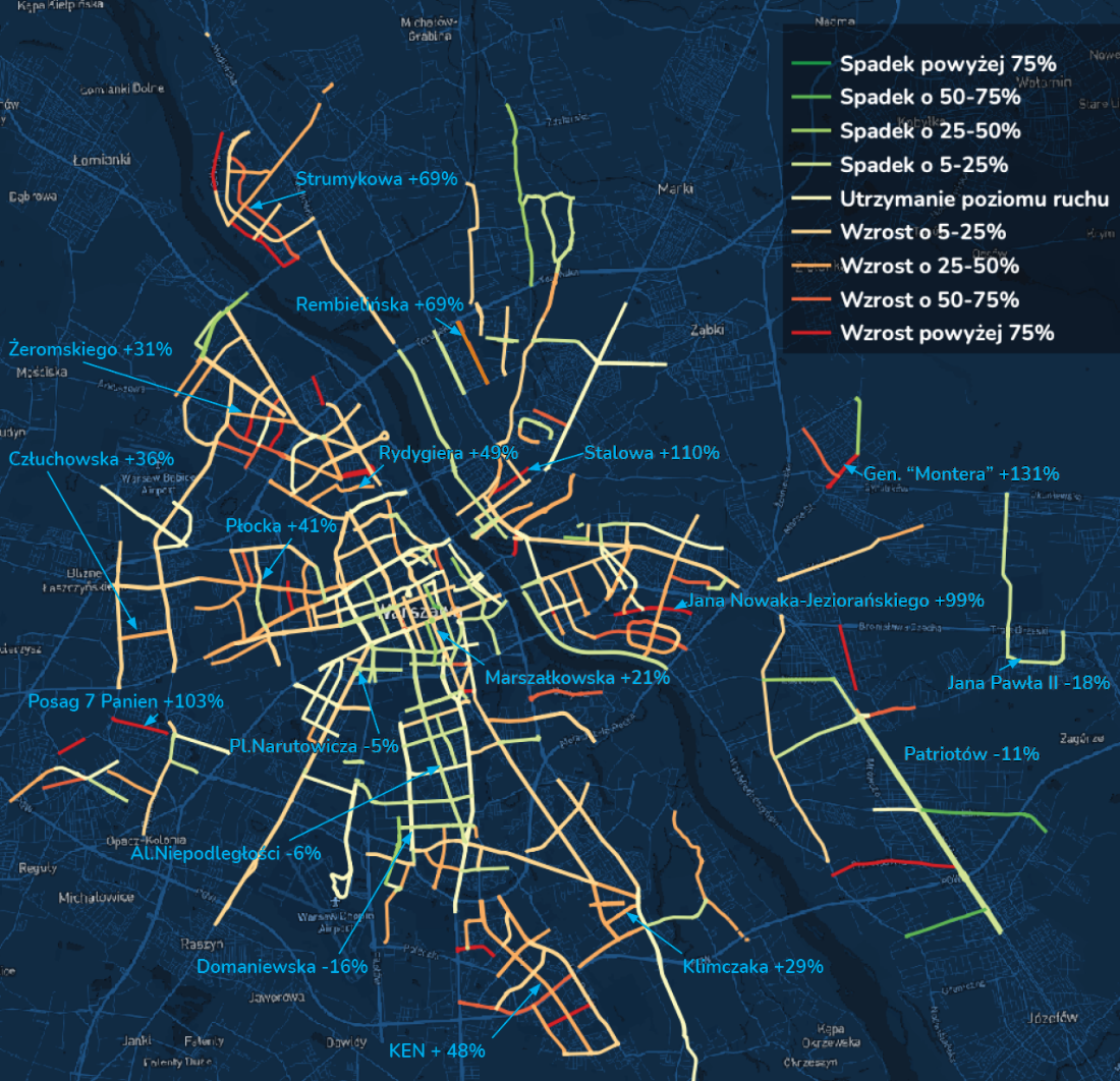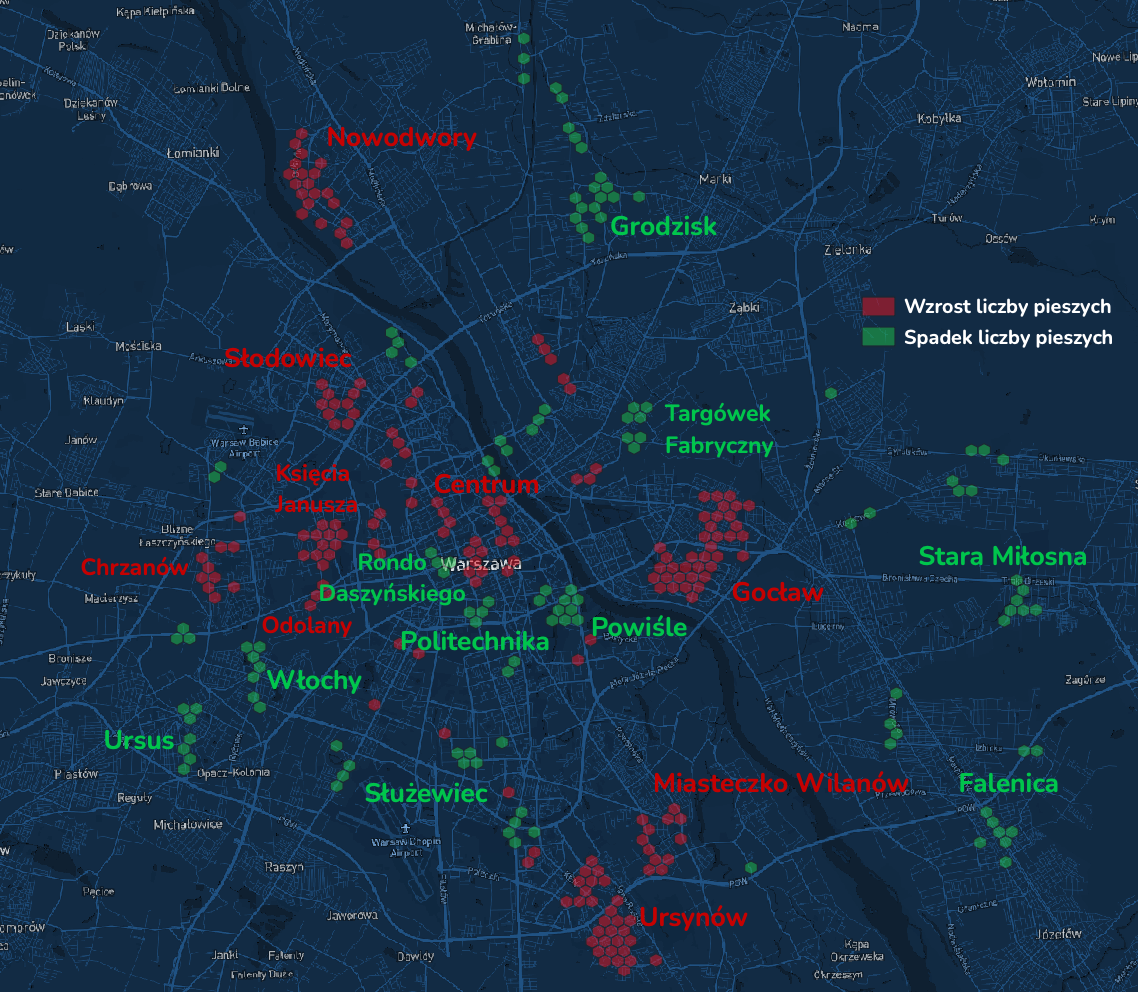Na podstawie danych CitiesAI można stwierdzić, że ruch pieszy w Warszawie wrócił do poziomu sprzed pandemii jednak jego rozkład w dzielnicach uległ zmianie. Do osiedli w których obserwuję się największy wzrost liczby pieszych należą nowe osiedla mieszkaniowe, które dodatkowo napędzają wzrost ruchu w okolicy. Dodatkowo inwestycje publiczne w centrum Warszawy poprawiające dostępność pieszą i rowerową mogły przyczynić się do szybszego powrotu tego obszaru do życia przedpandemicznego.