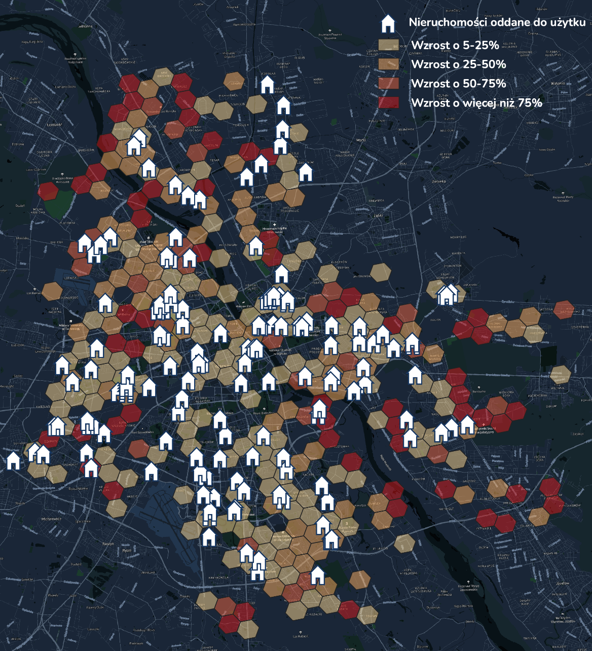 W czasie pandemii oddano do użytku prawie 300 nowych inwestycji. Porównując ich lokalizacje z ruchem pieszym można zauważyć między nimi istotną statystycznie korelacje. Wzrost liczby pieszych widać szczególnie w miejscach, gdzie tych nieruchomości powstaje dużo w jednym miejscu: na Pradze-Północ i Pradze Południe, na Żoliborzu Artystycznym, w Ursusie a nawet na trendującej w dół dzielnicy Wawer.