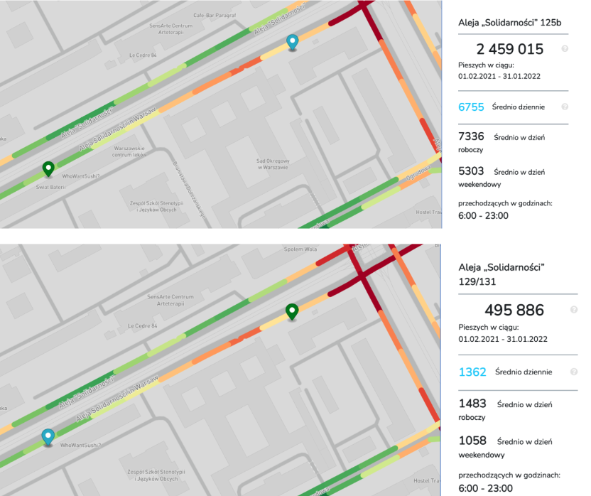 1. Aleja Solidarności 125b i Aleja Solidarności 129/131. Odległość – 250 m, różnica w liczbie pieszych w ciągu ostatniego roku w godzinach 6-23 - 396%