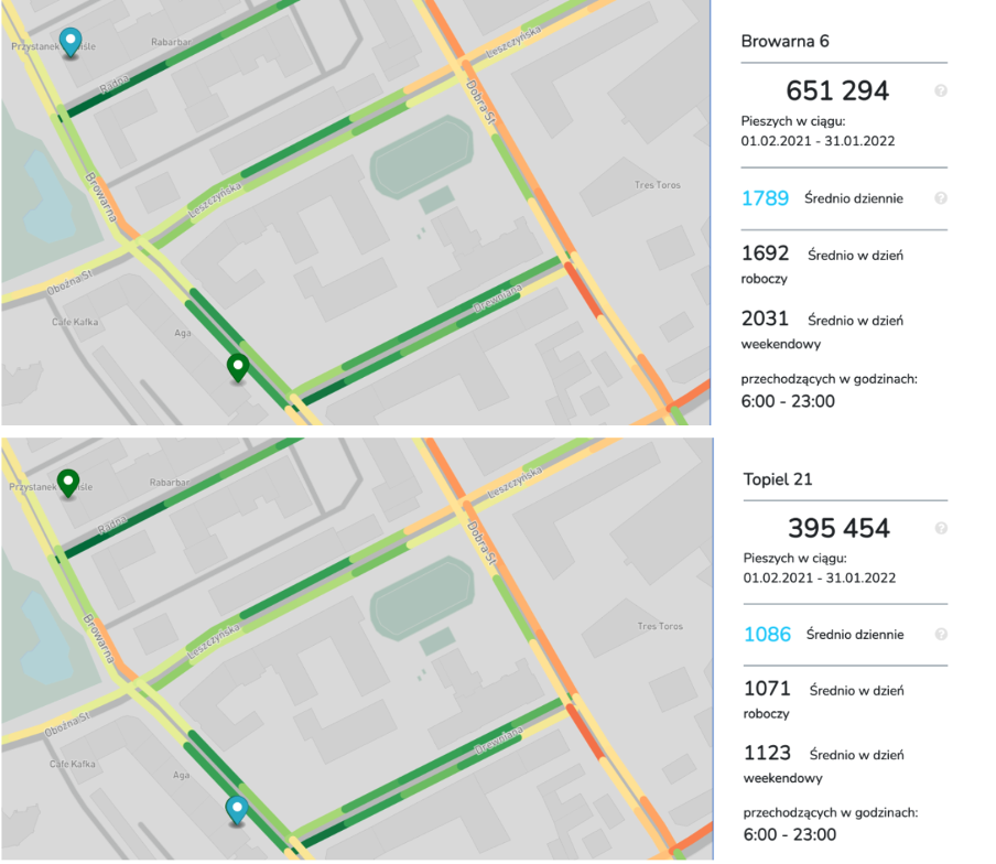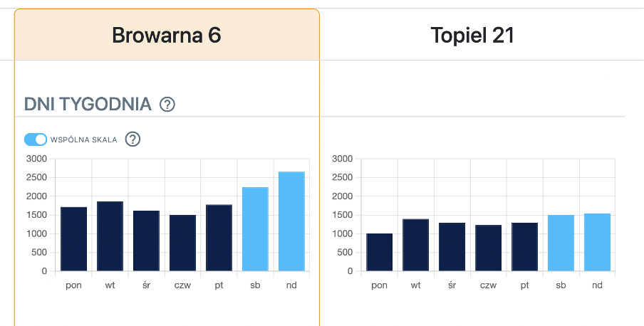 Kolejny przykład stanowią ulice Browarna i Topiel, które znajdują się w niewielkiej odległości od warszawskich Bulwarów Wiślanych. Wydawać by się mogło, że niewielki dystans dzielący lokale od Wisły i Centrum Nauki Kopernik ze względu na turystyczny charakter obszaru stanowi o podobnym potencjale obu miejsc. Jednak nawet 250 metrów odległości w doborze lokalu usługowego może mieć ogromne znaczenie dla późniejszego rozwoju Twojego biznesu. W pobliżu Browarnej 6 przechodzi rocznie o 65% osób więcej niż przy Topiel 21, a rozbieżność widać przede wszystkim w weekendy, kiedy różnica sięga nawet 81%.