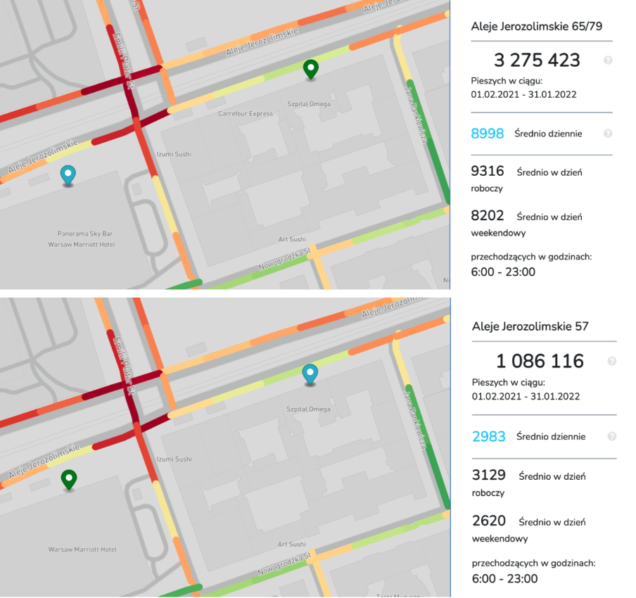 Ostatnim z przykładów jest jedna z najdłuższych ulic w Warszawie - Aleje Jerozolimskie. Jak widać, nawet ścisłe centrum Warszawy wcale nie musi gwarantować wszędzie tak samo dużego zainteresowania. Również tam odległość zaledwie 150 m wiąże się rocznie z prawie trzykrotnie większą liczbie osób przechodzących w pobliżu jednego z adresów. Z danych wynika, że nie dotyczy to tylko dni roboczych, ale również w weekendy występuje różnica na poziomie 213%.