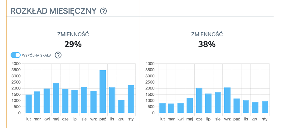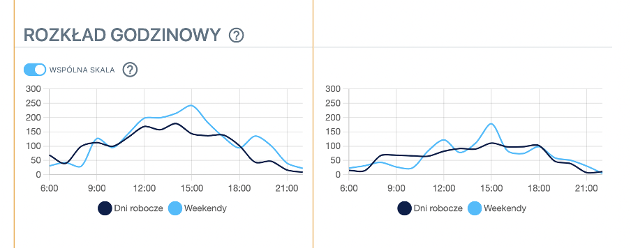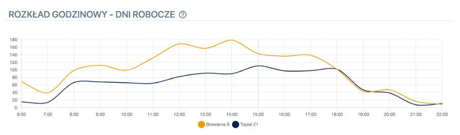 Z raportu jesteś dowiesz się, jakie dni tygodnia oraz które godziny generują największy ruch. Zaproponujemy Ci również najkorzystniejsze godziny otwarcia Twojego lokalu, a także pokażemy zmienność miesięczną - czy dane miejsce w lecie cieszy się tak samo wysokim zainteresowaniem jak zimą.