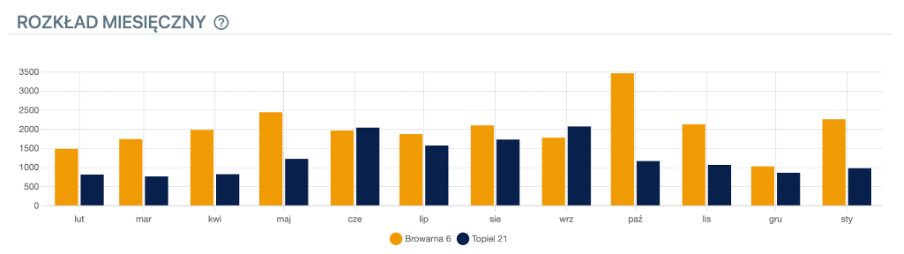 Z MapaPieszych.pl wiemy już, że ulica Browarna 6 cieszy się dużym przepływem pieszych w weekendy. Ze szczegółowego raportu natomiast, możemy dodatkowo wyciągnąć wniosek, że to przede wszystkim w niedziele można spodziewać się tu największej liczby przechodniów. Dodatkowo jesteśmy w stanie wywnioskować, że lokal przy tej ulicy, w weekendy powinien być otwarty dłużej niż w dni robocze, co zoptymalizuje wydatki na obsługę i powinno zmaksymalizować zysk. Dzięki szczegółowemu raportowi możemy też porównać ze sobą kolejne miesiące. Wyraźnie widać, że w przypadku ulicy Topiel 21 to głównie miesiące letnie generują przepływ ludzi. Browarna 6 natomiast charakteryzuje się mniejszą zmiennością w ciągu roku, a jedynym miesiącem ze znacznym przyrostem pieszych jest październik, co może również mieć kluczowe znaczenie dla funkcjonowania biznesu.