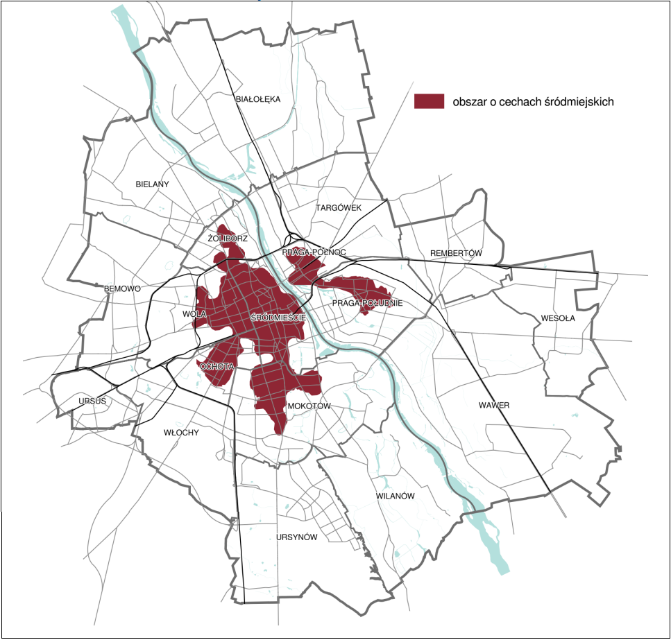 W Warszawskich dokumentach planistycznych strefa śródmieścia funkcjonalnego1 obejmuje Śródmieście oraz fragmenty Woli, Pragi Północ i Południe, Mokotowa, Ochoty i Żoliborza. Na tym obszarze mają koncentrować się funkcje usługowe o znaczeniu stołecznym, metropolitalnym, krajowym i międzynarodowym, w tym inwestycji celu publicznego, które w połączeniu z zabudową mieszkaniową będą ogniskowały życie społeczne metropolii warszawskiej2. Granice obszaru o cechach śródmiejskich, wyznaczono na podstawie szeregu czynników m.in. intensywności zabudowy, koncentracji instytucji, usług komercyjnych czy sieci przystanków i ulic.