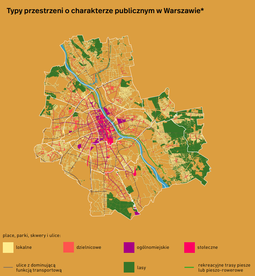 Biuro Architektury i Planowania Przestrzennego m.st. Warszawy przygotowało mapę z podziałem na typy przestrzeni publicznych w Warszawie. Jakie typy dominują na obszarze z wysokim indeksem ruchu pieszego ponadlokalnego? Są to na pewno przestrzenie o charakterze stołecznym, które dominują w dzielnicy Śródmieście, która cała została zakwalifikowana do nowego obszaru funkcjonalnego. Generatorem ruchu ponadlokalnego są również przestrzenie ogólnomiejskie, takie jak na Pradze: Park Skaryszewski i ZOO Warszawskie, Pole Mokotowskie na Mokotowie, czy Cmentarz Powstańców Warszawy na Woli.