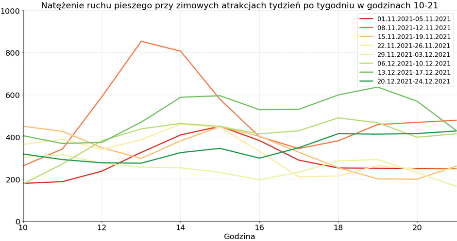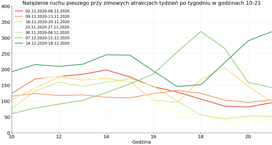 Od połowy listopada krótsze dni wraz z malejącymi temperaturami powietrza coraz bardziej zniechęcały pieszych do spacerów w okolicach zimowych atrakcji (tzn. Starego Miasta, Multimedialnego Parku Fontann oraz Łazienek Królewskich). Ruch pieszy osiągnął najniższy poziom na samym początku grudnia, gdy Uniwersytet Warszawski, którego główna siedziba znajduje się przy ul. Krakowskie Przedmieście, ogłosił przeniesienie zajęć do trybu zdalnego. W pobliżu kampusu UW w godzinach 10-21 obserwowaliśmy spadek ilości pieszych o niemal 20%. Ten spadek widać również na załączonej mapie Krakowskiego Przedmieścia i Nowego Światu. Jednak wraz z uruchomieniem iluminacji świetlnych w okolicach mikołajek zaobserwowaliśmy ponowny wzrost liczby przechodniów.