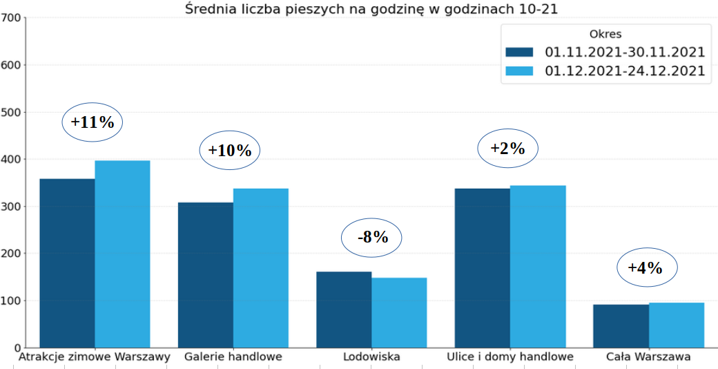 Na podstawie 10 milionów zdjęć z całej Warszawy wiemy, że w godzinach 10-21 w okresie od 1 listopada do 24 grudnia 2021 roku ruch w stolicy wzrósł o 30% w porównaniu z rokiem ubiegłym. Co istotne, turystyczne części Warszawy charakteryzują się jeszcze większą zmianą. Dane wyliczone na podstawie 12 tysięcy zdjęć wykonanych przy ul. Nowy Świat i ul. Krakowskie Przedmieście wskazują, że we wspomnianym okresie w dni robocze liczba osób wzrosła aż o 106%! Na pewno do tak pozytywnego wyniku przyczyniły się znacznie łagodniejsze restrykcje niż w 2020 roku.