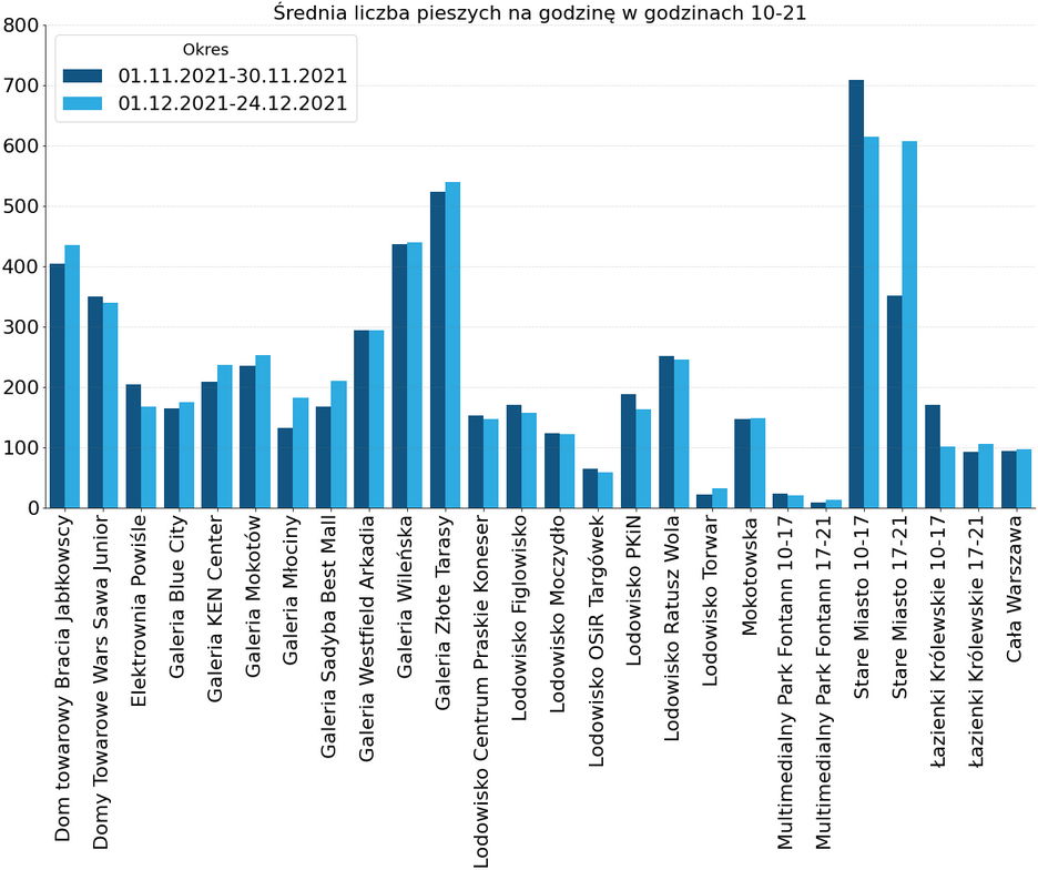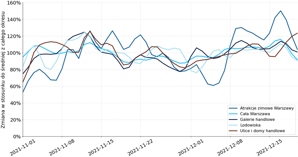 Zakupy spożywcze przed świętami, kupno prezentów oraz innych niezbędnych rzeczy przyczyniły się do porównywalnego do atrakcji zimowych zainteresowania galeriami handlowymi - zaobserwowaliśmy wzrost na poziomie 10%. W grudniu natomiast zanotowano mniej osób w okolicach lodowisk. Być może w świątecznym pośpiechu nie było czasu na rozrywkę, a warszawiacy skupili się głównie na organizacji wigilijnej kolacji.