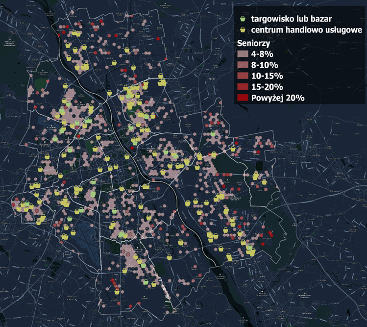 Osoby powyżej 60 roku życia zazwyczaj stanowią do około 4% udziału w demografii pieszych. Poniższa mapa przestawia obszary, w których seniorzy wyróżniają się większym udziałem. Są to obszary głównie starszych osiedli wielorodzinnych (korelacja 0,11) takich jak Bródno czy Gocław. Można tez zauważyć zwiększony udział seniorów w ruchu pieszym przy targowiskach takich jak Hala Banacha, Bazar Lotników czy Targowisko Wolumen oraz centrach usługowo handlowych (korelacja 0,19). Jednak w tym przypadku nie są to duże galerie handlowe typu Atrium Reduta czy Złote Tarasy, częściej mniejsze pawilony.