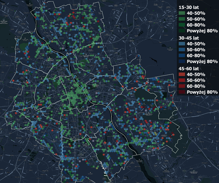 Na mapie zaznaczono obszary, w których udział grup wiekowych 15-30, 30-45 lub 45-60 w danym heksagonie stanowi powyżej 40% pieszych. Jak łatwo można zauważyć osoby w wieku 15-30 lat dominują w Śródmieściu szczególnie na Powiślu i Mariensztacie, w okolicach Uniwersytetu Warszawskiego czy Pałacu Kultury i Nauki. Obserwuje się również więcej pieszych z tej grupy wiekowej w zabudowie wielorodzinnej (korelacja 0,11).