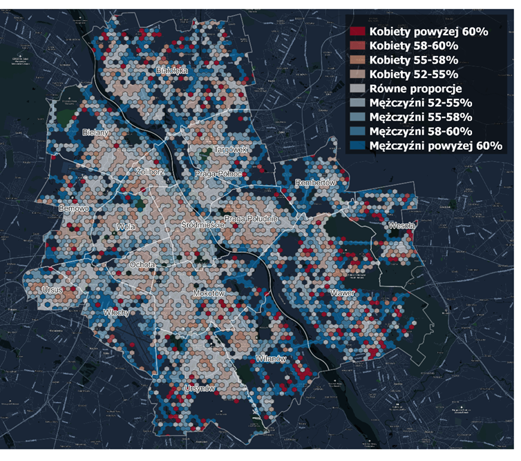 Postanowiliśmy sprawdzić, jak wygląda udział kobiet i mężczyzn na poszczególnych osiedlach lub dzielnicach Warszawy. Warto podkreślić, że wszystkie przedstawione w artykule analizy dotyczą pieszych, którzy niekoniecznie muszą być mieszkańcami danej dzielnicy. Okazuje się, że mężczyźni przeważają na obrzeżach w dzielnicach takich jak Rembertów czy Wawer. Większy udział obserwuje się również na osiedlach na których występują duże zakłady przemysłowe (korelacja 0,18) np. na Bielanach – Huta Arcelor-Mittal lub Włochy – ul. Działkowa. Z kolei kobiety przodują w dzielnicach centralnych np. w Śródmieściu i Żoliborzu, gdzie dużą część stanowią przestrzenie usługowo – handlowe. Dodatkowo większy udział Pań zauważalny jest również na osiedlach z zabudową wielorodzinną (korelacja 0,31) takich jak chociażby Gocław czy miasteczko Wilanów.