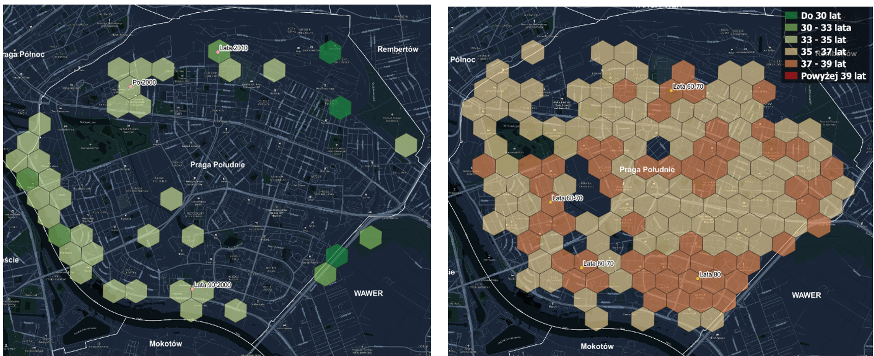 Na podstawie danych o warszawskiej zabudowie postanowiliśmy sprawdzić czy lata w jakich zostało wybudowane dane osiedle ma związek ze średnią wieku pieszych na tym obszarze. Na Ursynowie można zauważyć, że im młodsze osiedle, tym niższa średnia wieku pieszego. Od wybudowanego w latach 70. osiedla Ursynów Północny, po zabudowę lat 80. na Natolinie (spadek średniej o ok. 1-2 lata) aż do najmłodszych Kabat, które pochodzą z lat 90-2000. Na Pradze-Południe możemy zaobserwować, że powiązanie roku powstania zabudowy ze średnią wieku pieszych jest silne do lat 70. W okolicach z zabudową z lat 60. i 50. widzimy już ponownie młodszą populację, co może wskazywać, że mieszkania są przekazywane z pokolenia na pokolenie lub że osiedla te oferują funkcję, które przyciągają pieszych z różnych grup wiekowych.