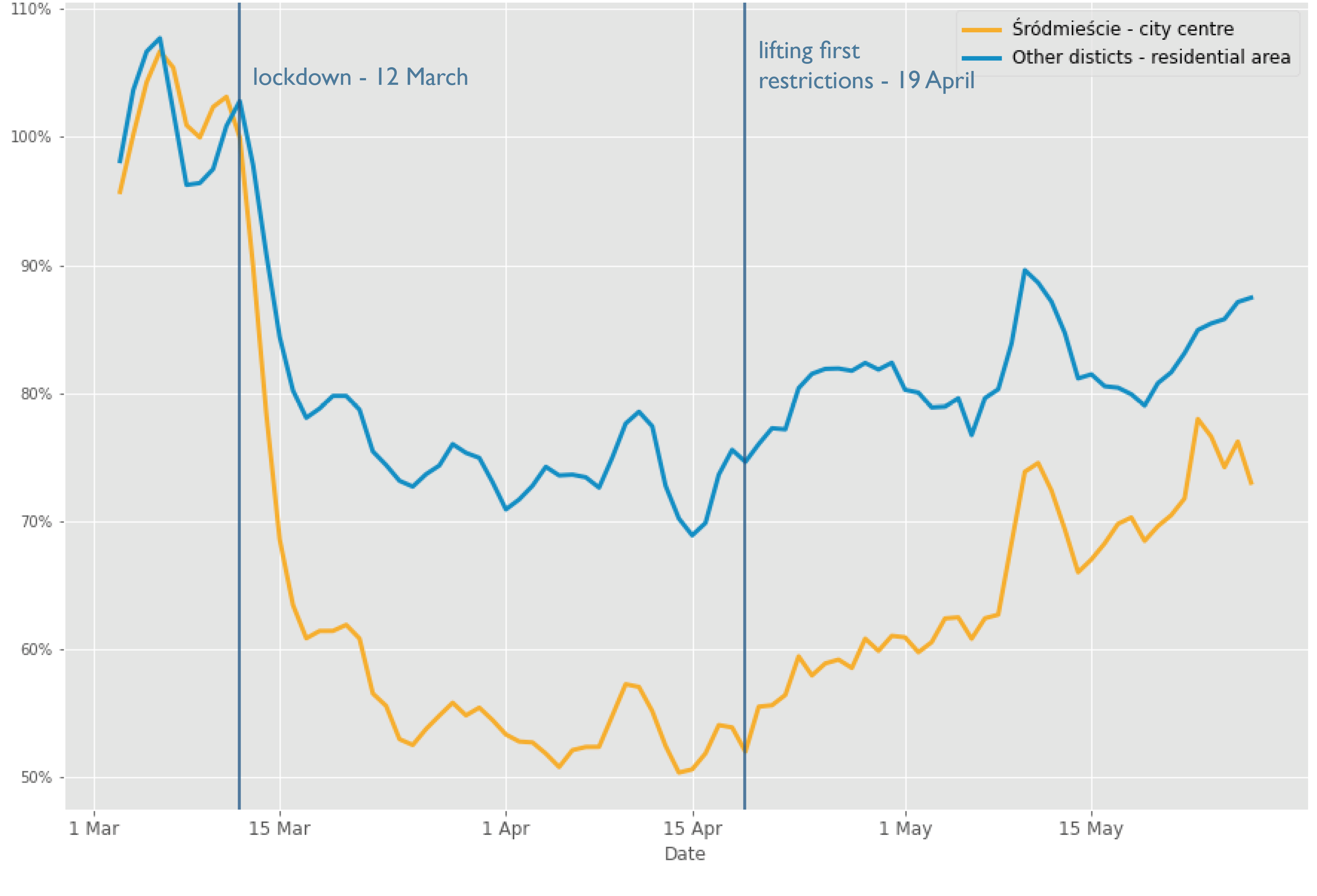 Cities AI is a Polish tech start-up providing insights on people flow on the streets of Warsaw pre-and during coronavirus pandemic. Our day to day monitoring confirms the obvious - the restrictions taken by Polish government in mid of March lead to sharp decrease of people traffic. First week after lock down we noted 44% less people on Warsaw streets that in pre-COVID-19 times. However – comparing people flow among different districts of Warsaw brings to attention significant differences in pedestrian traffic drop between City center (noted over 60% of decrease in people flow in comparison to pre-COVID-19 times) and the rest of the town (mainly described as residential area with on average 33% of people traffic decrease).