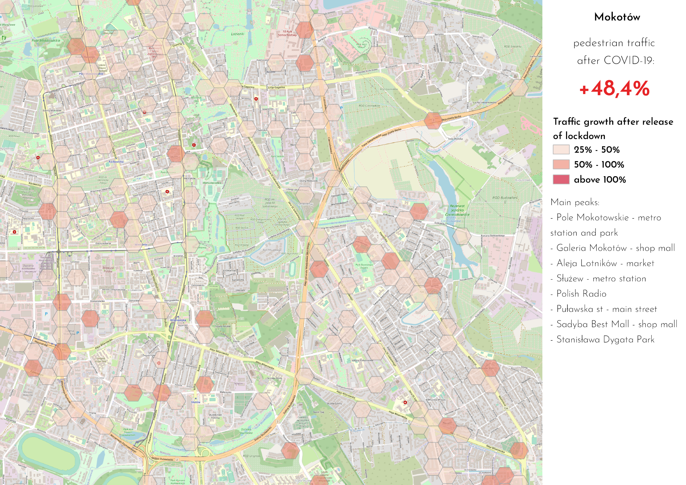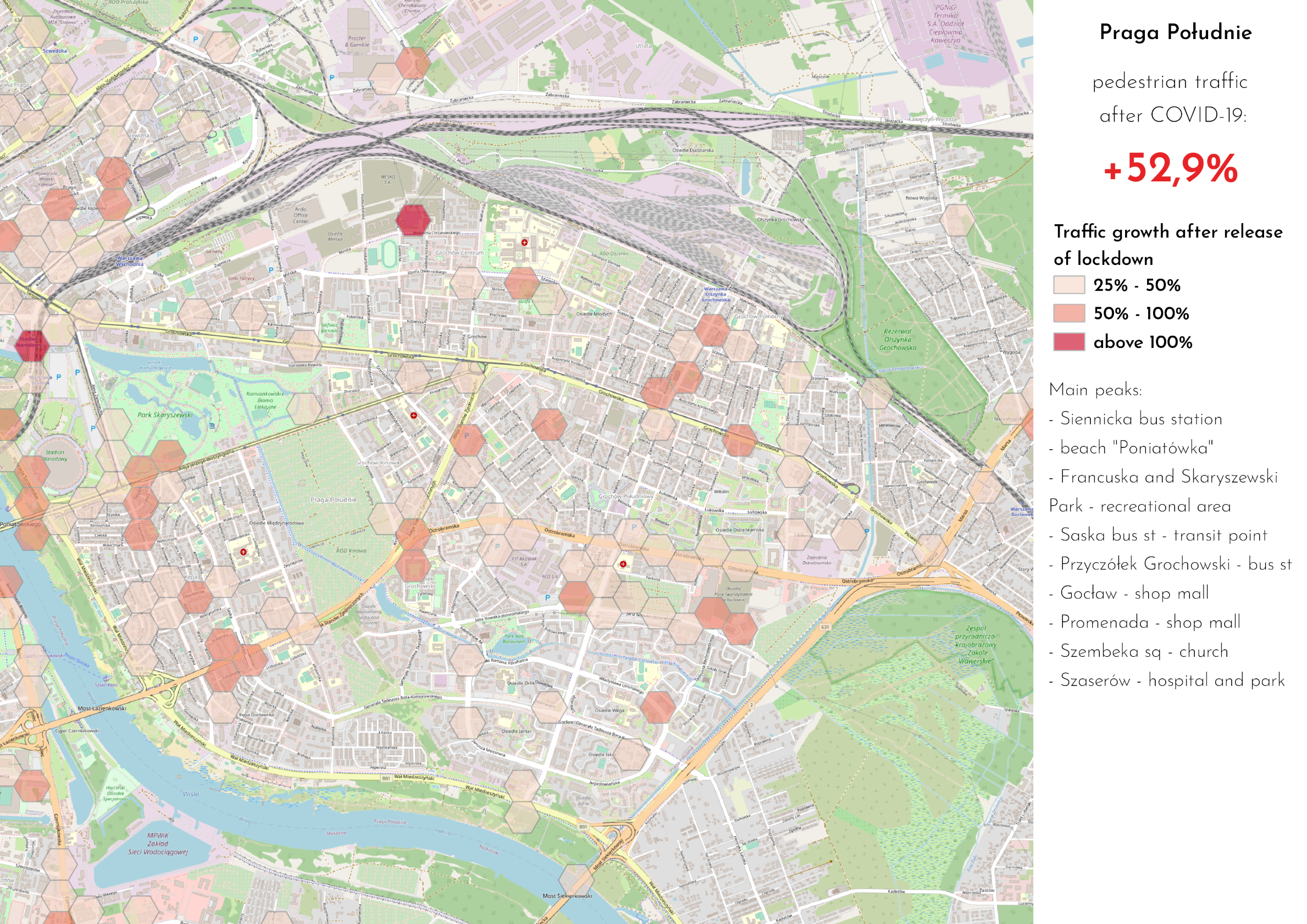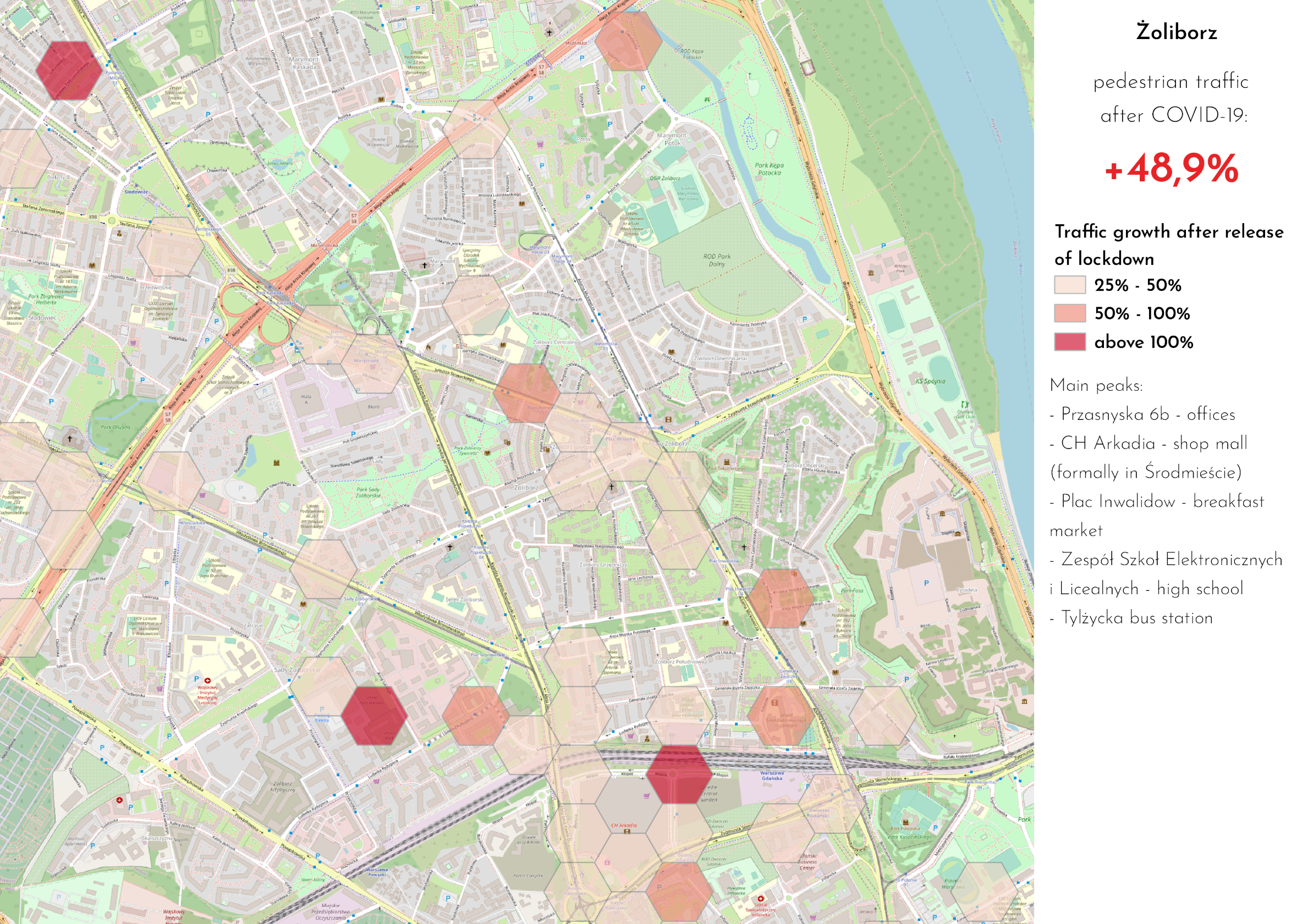 We have chosen couple of Warsaw districts pointing out specific locations within those districts where people’ density significantly changed and grew in comparison to lock down period. Although we collect data 24/7, for the purposes of this analysis we put attention to business day only, analysing time frame from 6 am to 9 pm. Data on maps below are color-coded to show people flow volumes and percentages of growth in particular points of interests. As analysis shows biggest traffic comes from public transport locations, city markets and shopping malls. City center of Warsaw noted biggest growth in pedestrian traffic (over 70% more people in comparison to lock down period), other districts grew their pedestrian traffic on average over 50%.