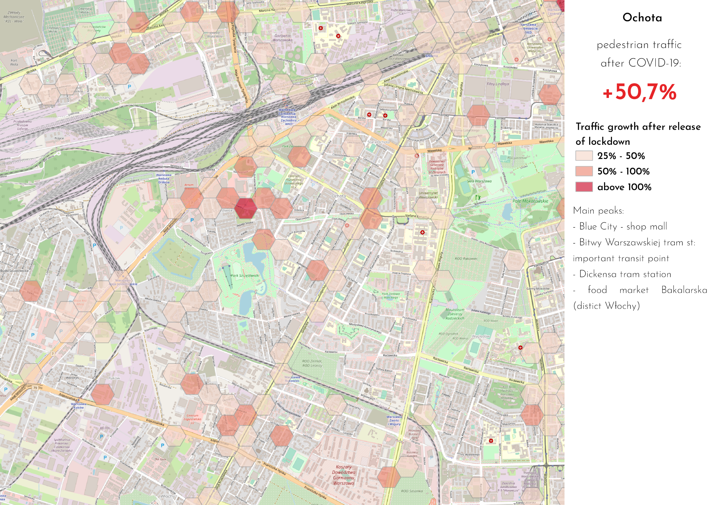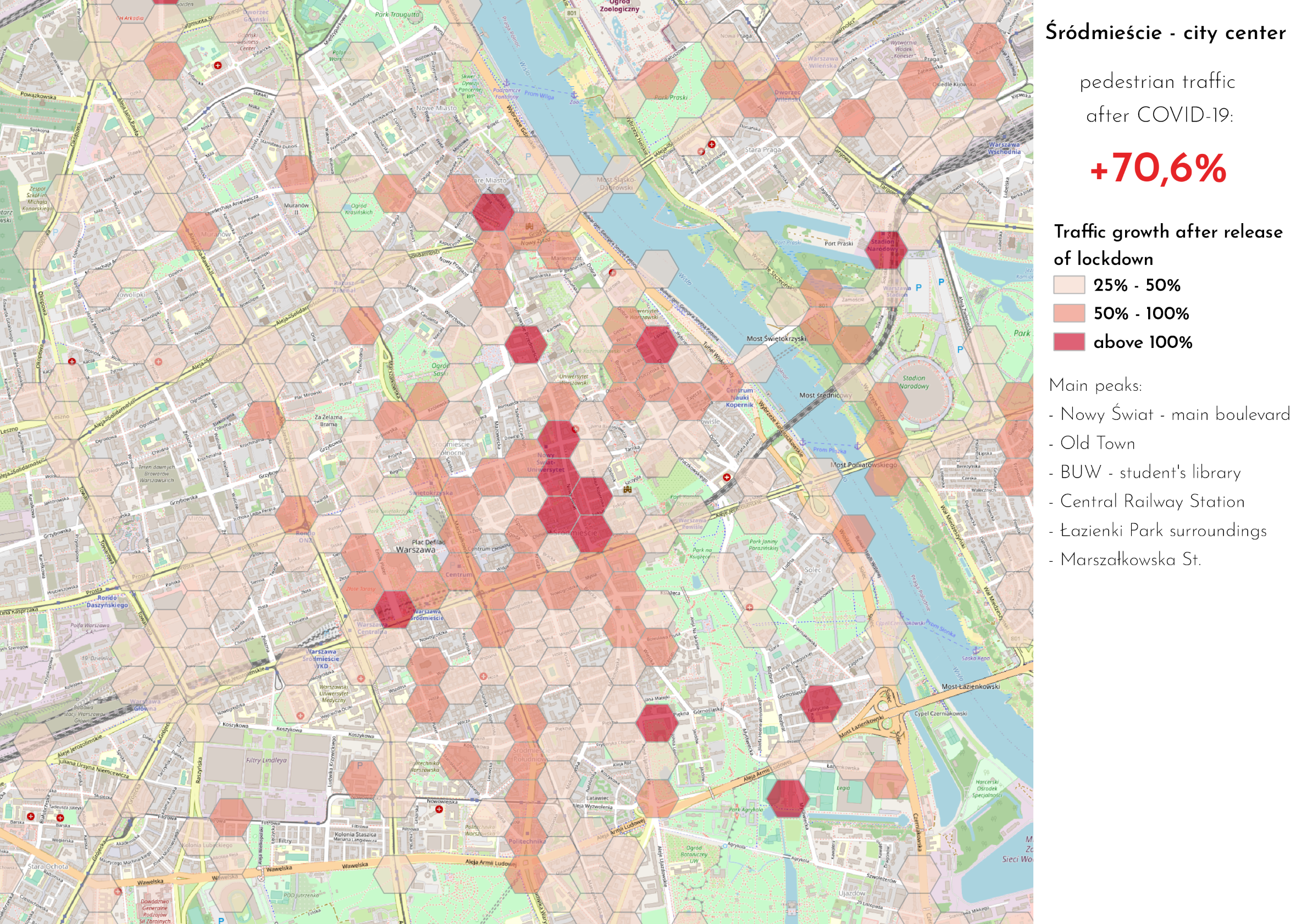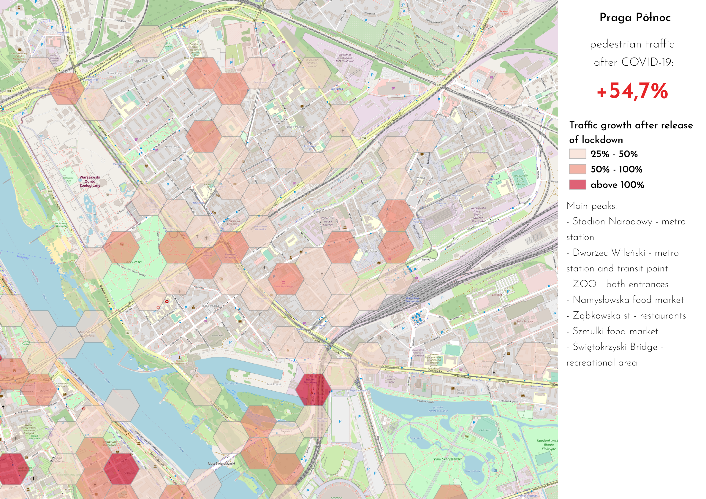 We have chosen couple of Warsaw districts pointing out specific locations within those districts where people’ density significantly changed and grew in comparison to lock down period. Although we collect data 24/7, for the purposes of this analysis we put attention to business day only, analysing time frame from 6 am to 9 pm. Data on maps below are color-coded to show people flow volumes and percentages of growth in particular points of interests. As analysis shows biggest traffic comes from public transport locations, city markets and shopping malls. City center of Warsaw noted biggest growth in pedestrian traffic (over 70% more people in comparison to lock down period), other districts grew their pedestrian traffic on average over 50%.
