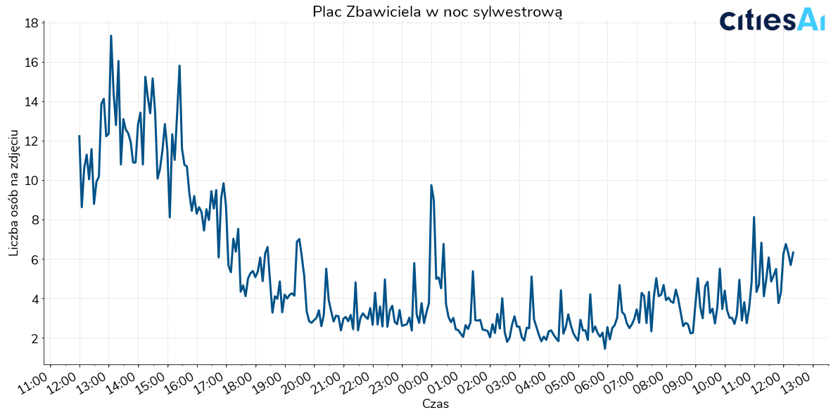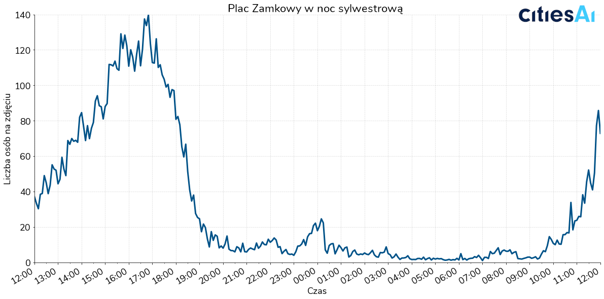 Podobne tendencje dostrzegliśmy na terenie całego miasta. Wieczorem nasze kamery „wyłapywały” średnio 1 osobę na zdjęciu, jednak krótko po wybiciu dwunastej ich liczba wzrosła kilkukrotnie. To może świadczyć, że na ogół warszawiacy starali się przestrzegać zasad, ale tylko niektórych zakaz przemieszczania się powstrzymał przed pokusą wystrzelenia fajerwerków wraz z nadejściem Nowego Roku.