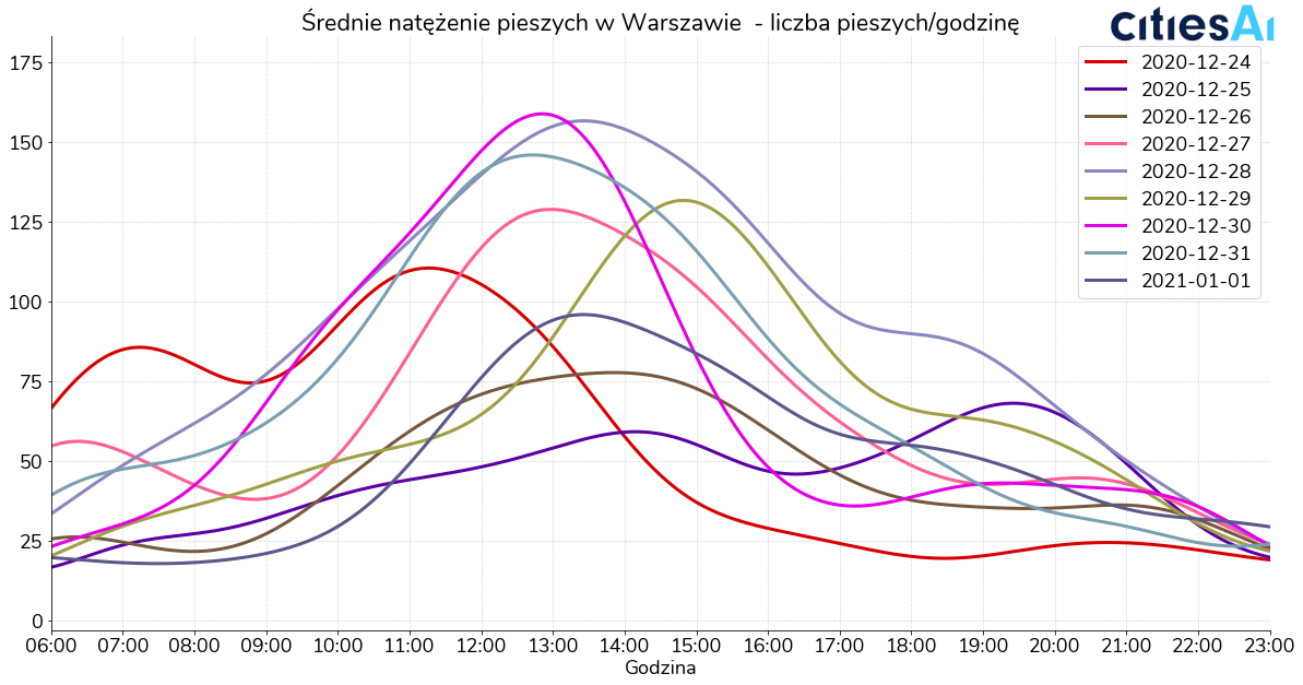 Szczyt natężenia ruchu przypadł z kolei na okres 28-31 grudnia. Po godz. 12 chodnikami Warszawy przechodziło średnio ponad 150 osób na godzinę. W okolicach godz. 19 liczba ta zazwyczaj malała do 30 osób.