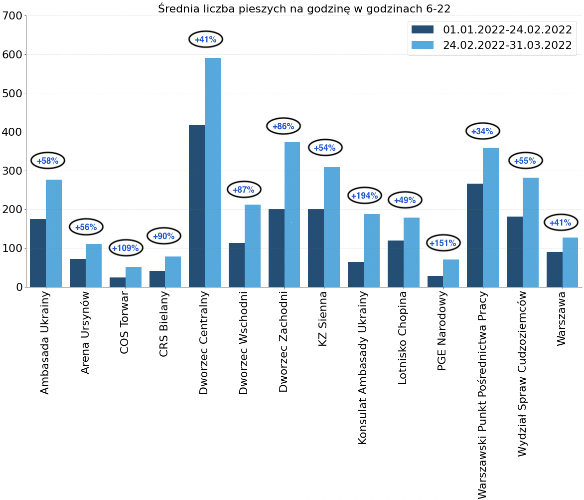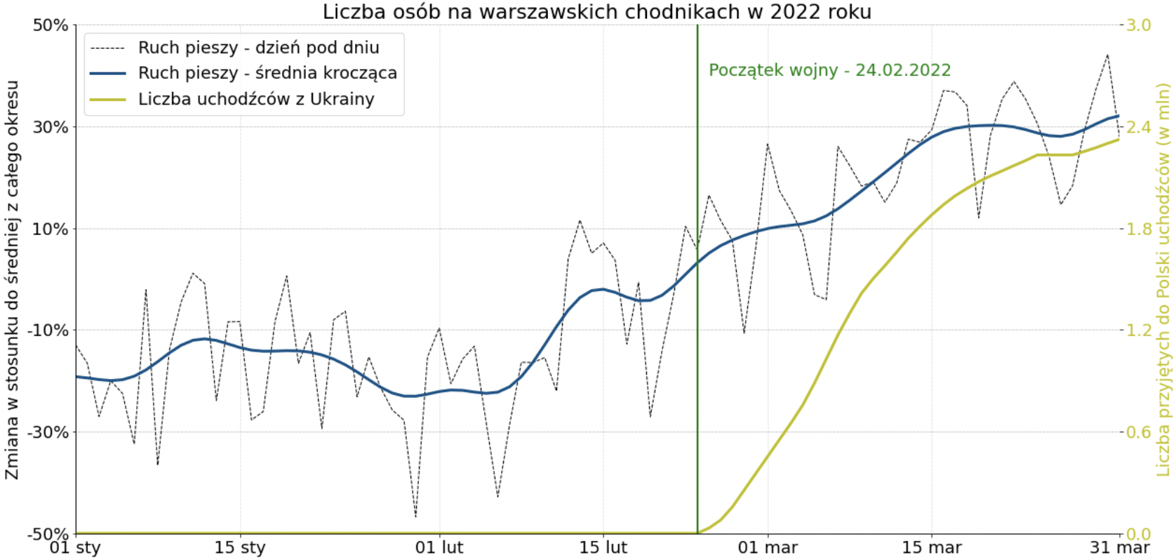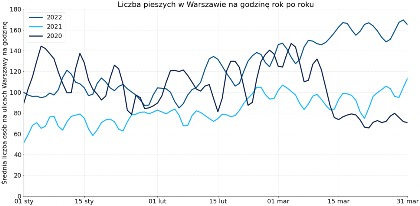Marzec 2022 roku był inny niż te w poprzednich latach. Miesiąc ten okazał się rekordowy pod względem liczby pieszych. Można powiedzieć, że to jeden z pierwszych miesięcy od dwóch lat, kiedy zniesiono niemal wszystkie pandemiczne obostrzenia. Jednak wydaje się, że największy wpływ na poziom ruchu miał przede wszystkim tłum uciekających przed wojną ludzi. Jak informuje stołeczny ratusz, liczba mieszkańców Warszawy wzrosła od początku inwazji o 17% (informacja z 17 marca 2022 roku). Ciężko więc ten rok porównywać do poprzednich, kiedy to w 2020 roku wybuchła pandemia i nastąpił gwałtowny spadek liczby pieszych, natomiast w 2021 trwał okres ograniczeń pandemicznych.