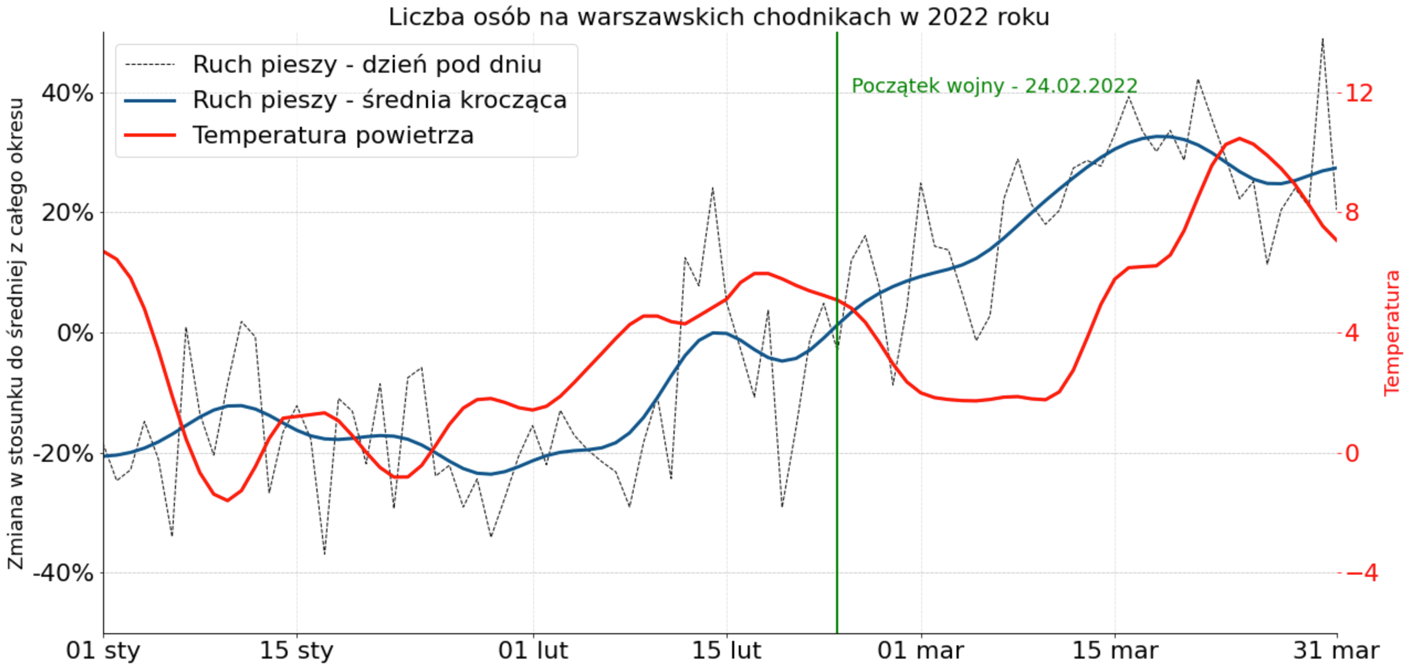 Początek marca przyniósł warszawiakom nieco niższe temperatury powietrza, jednak nie odnotowaliśmy z tego powodu spowolnienia wzrostu liczby pieszych. Może to dowodzić, że właśnie migracja ludzi z Ukrainy najbardziej przyczyniła się do tak dynamicznego przyrostu.