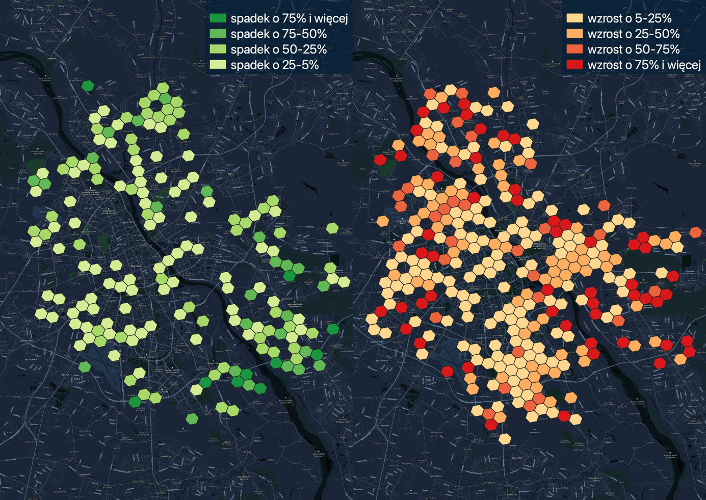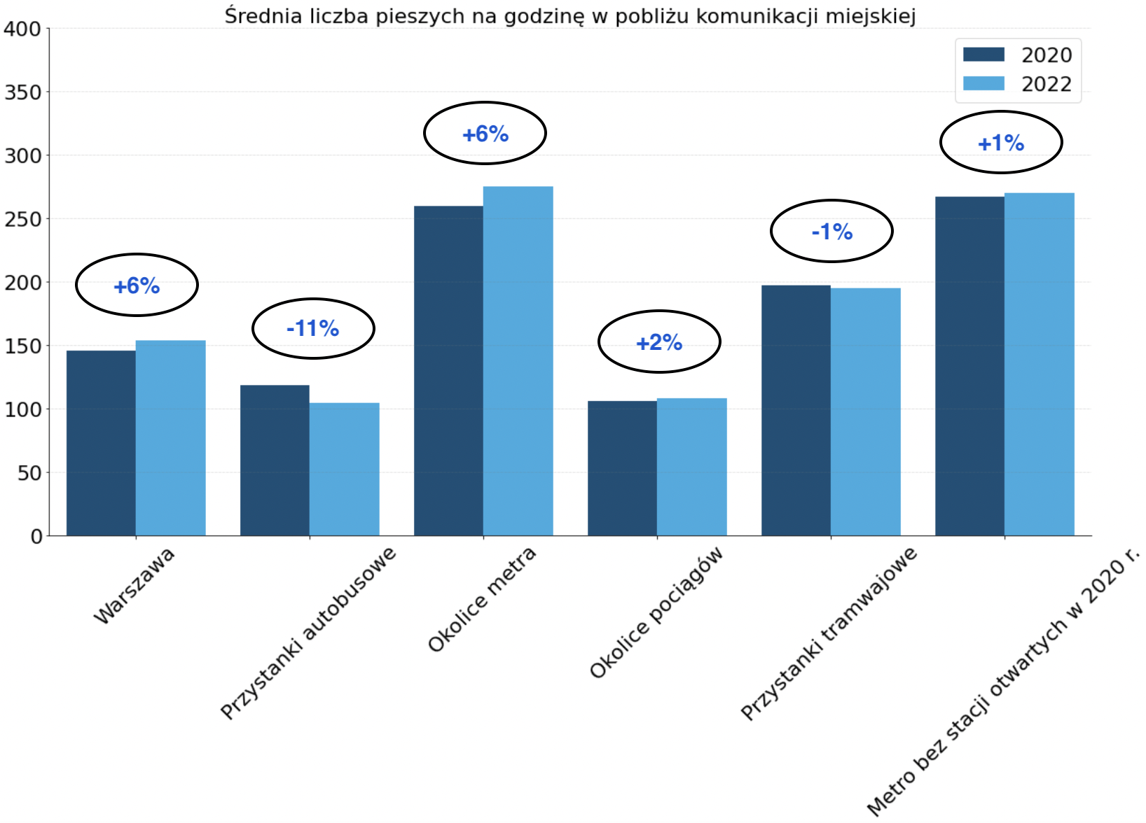 Według warszawskich danych pod koniec 2021 roku do komunikacji miejskiej powróciło 80% osób w porównaniu z końcem 2019 roku, czyli okresu przed pandemią. Zbadaliśmy więc rozkład ludzi w okolicach przystanków i wejść do metra porównując dwa okresy: styczeń, luty 2020 oraz te same miesiące 2022 roku. Według danych o ruchu pieszym CitiesAI, jedynie okolice przystanków autobusowych notują spadek na poziomie 12% w porównaniu do początku 2020 roku. Przy przystankach tramwajowych, kolejowych, a także w okolicach wejść do metra (nie biorąc pod uwagę stacji otwartych w 2020 roku) obserwujemy różnice jedynie na poziomie 1-2%. Oznacza to, że najprawdopodobniej warszawska komunikacja miejska powoli wraca do poziomu sprzed wybuchu pandemii zwłaszcza w kontekście transportu szynowego.