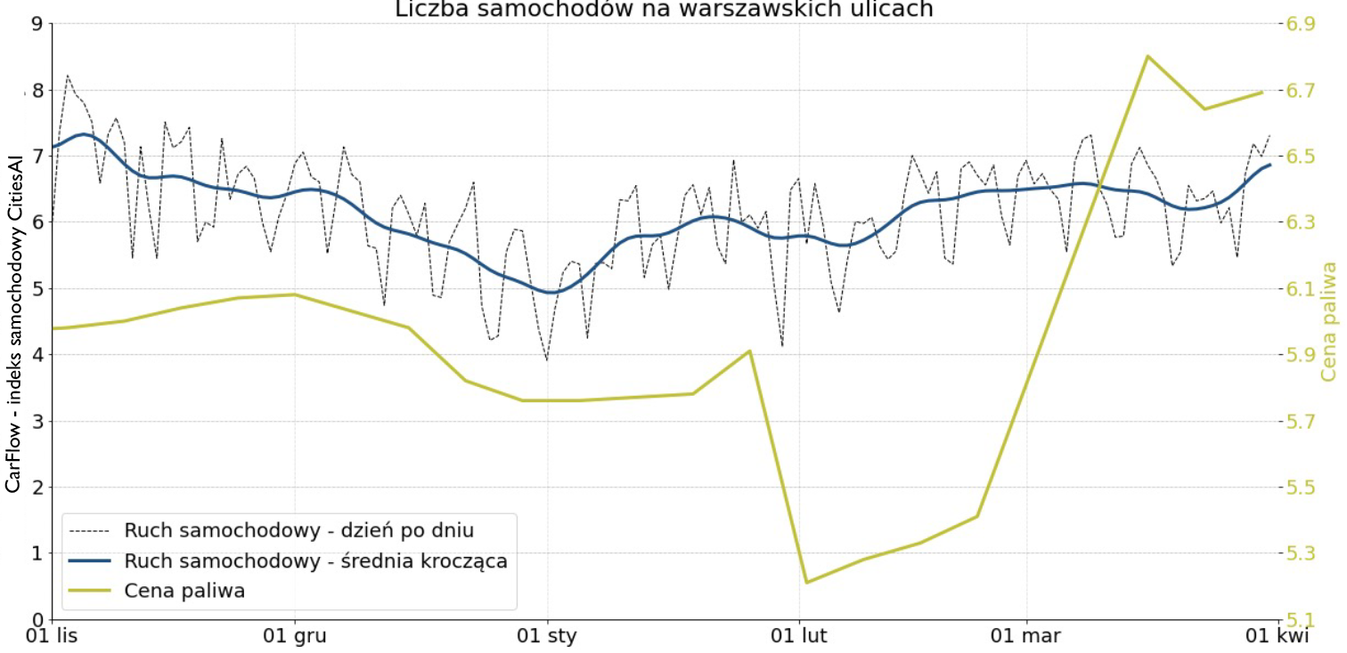 Gwałtowny wzrost ceny paliwa to kolejne istotne zdarzenie, które miało miejsce w pierwszym kwartale 2022 roku. Spróbowaliśmy więc sprawdzić korelację pomiędzy ceną paliwa a ruchem samochodowym. Okazuje się, że mimo wysokich cen paliwa nie odnotowaliśmy z tego powodu żadnych znaczących zmian w liczbie samochodów na ulicach Warszawy.